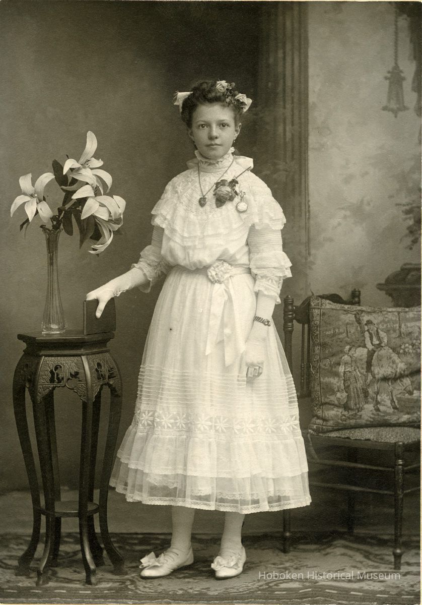 Black-and-white photograph of Rose Beck, age 13, in her confirmation dress, posed in photographer's studio, Hoboken, March 1910.