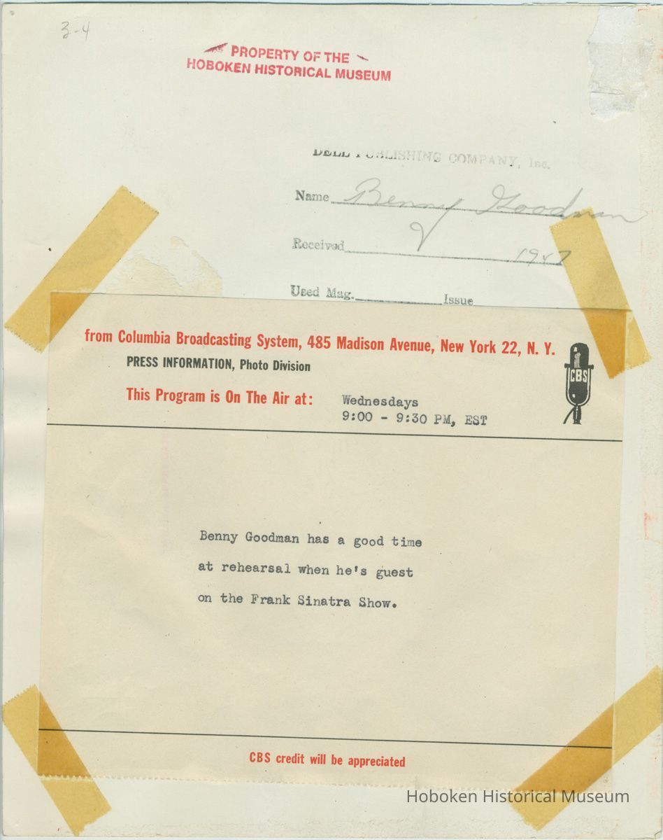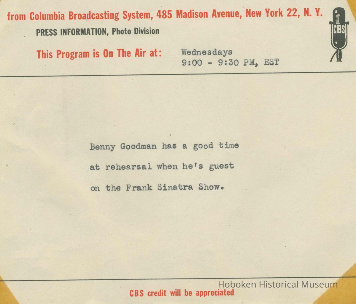 Black-and-white photo of Frank Sinatra and Benny Goodman during rehearsal for Sinatra's CBS radio show, 1947. Attached to the reverse is a press release caption from the Columbia Broadcasting System: "Benny Goodman has a good time at rehearsal when he's guest on the Frank Sinatra Show."