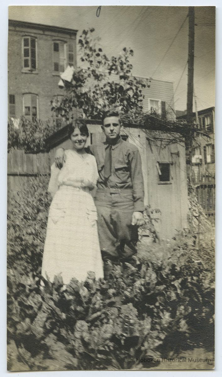 B+W photo of Rose Beck & fiance George Jaxel in his U.S. Army uniform, backyard garden, 600 Monroe St.?, Hoboken, Sun., Aug. 18, 1918.
