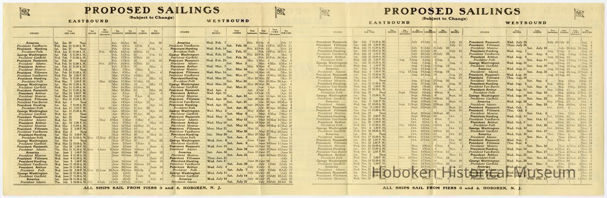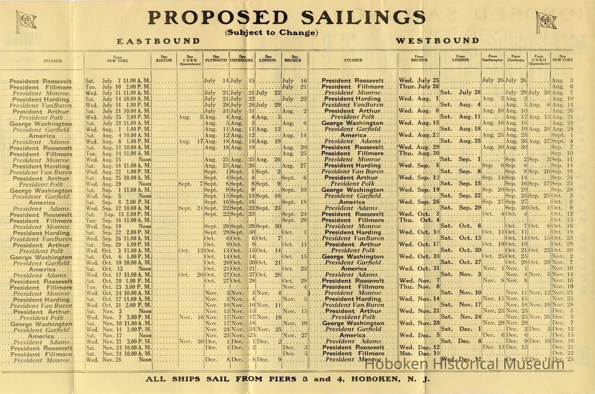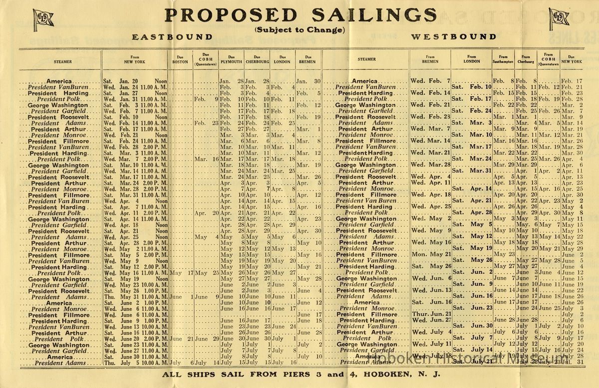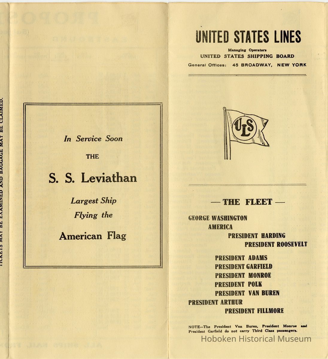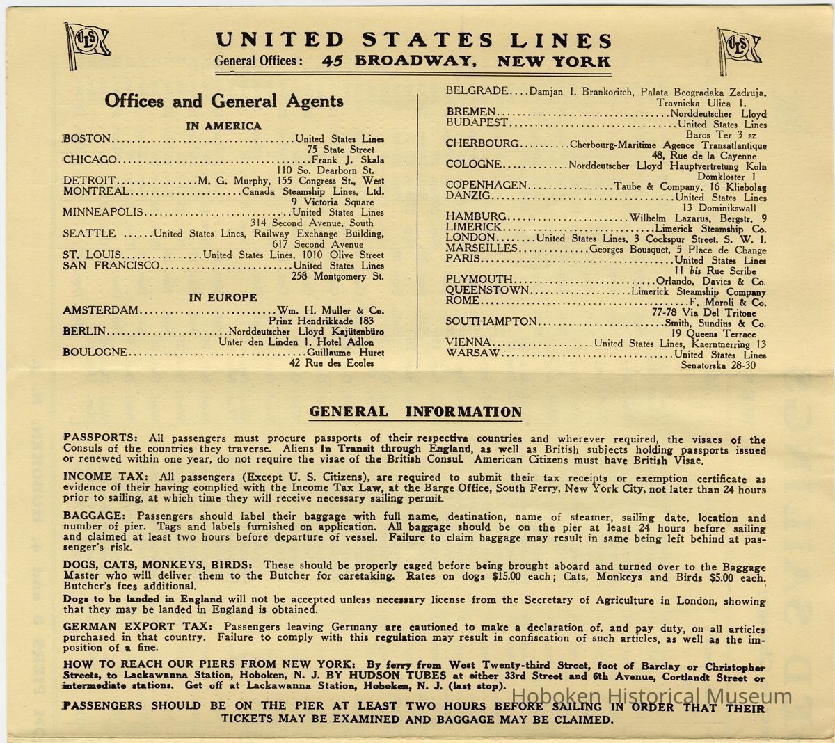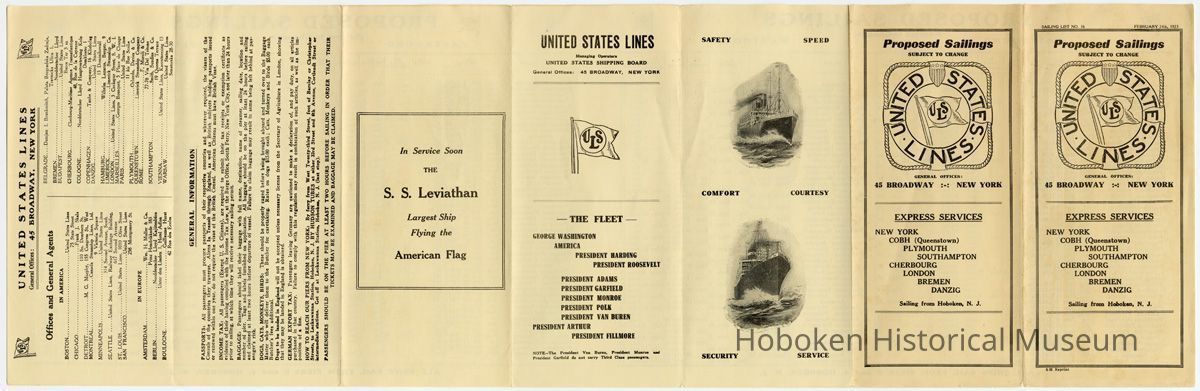 Notes: Selected text from archives 2013.005.0055 === In Service Soon The S. S. Leviathan Largest Ship Flying the American Flag ==== UNITED STATES LINES Managing Operators UNITED STATES SHIPPING BOARD General Offices: 45 BROADWAY, NEW YORK — THE FLEET — GEORGE WASHINGTON AMERICA PRESIDENT HARDING PRESIDENT ROOSEVELT PRESIDENT ADAMS PRESIDENT GARFIELD PRESIDENT MONROE PRESIDENT POLK PRESIDENT VAN BUREN PRESIDENT ARTHUR PRESIDENT FILLMORE NOTE—The President Van Buren, President Monroe and 'President Garfield do not carry Third Class passengers. ==== UNITED STATES LINES General Offices: 45 BROADWAY, NEW YORK Offices and General Agents IN AMERICA BOSTON....................................United States Lines 75 State Street CHICAGO......................................Frank J. Skala 110 So. Dearborn St. DETROIT................M. G. Murphy, 155 Congress St., West MONTREAL......................Canada Steamship Lines, Ltd. 9 Victoria Square MINNEAPOLIS.............................United States Lines 314 Second Avenue, South SEATTLE ......United States Lines, Railway Exchange Building, 617 Second Avenue ST. LOUIS................United States Lines, 1010 Olive Street SAN FRANCISCO..........................United States Lines 258 Montgomery St. IN EUROPE AMSTERDAM...........................Wm. H. Muller & Co. Prinz Hendrikkade 183 BERLIN........................Norddeutscher Lloyd Kajiitenbiiro Unter den Linden 1, Hotel Adlon BOULOGNE...................................Guillaume Huret 42 Rue des Ecoles BELGRADE. .. .Damjan I. Brankoritch, Palata Beogradaka Zadruja, Travnicka Ulica 1. BREMEN..................................Norddeutscher Lloyd BUDAPEST.................................United States Lines Baros Ter 3 sz CHERBOURG..........Cherbourg-Maritime Agence Transatlantique 48, Rue de la Cayenne COLOGNE.............Norddeutscher Lloyd Hauptvertretung KoIb Domkloster 1 COPENHAGEN.................Taube & Company, 16 Kliebolag DANZIG....................................United States Lines 13 Dominikswall HAMBURG........................Wilheim Lazarus, Bergstr. 9 LIMERICK..............................Limerick Steamship Co, LONDON........United States Lines, 3 Cockspur Street, S. W. I. MARSEILLES..............Georges Bousquet, 5 Place de Change PARIS......................................United States Lines 11 bis Rue Scribe PLYMOUTH............................Orlando, Davies & Co. QUEENSTOWN....................Limerick Steamship Company ROME.........................................F. Moroli & Co, 77-78 Via Del Tritone SOUTHAMPTON.........................Smith, Sundius & Co. 19 Queens Terrace VIENNA............. .......United States Lines, Kaerntnerring 13 WARSAW..................................United States Linee Senatorska 28-30 GENERAL INFORMATI ON PASSPORTS: All passengers must procure passports of their respective countries and wherever required, the visaes [visas] of the Consuls of the countries they traverse. Aliens In Transit through England, as well as British subjects holding passports issued or renewed within one year, do not require the visae of the British Consul. American Citizens must have British Visae. INCOME TAX: All passengers (Except U. S. Citizens), are required to submit their tax receipts or exemption certificate as evidence of their having complied with the Income Tax Law, at the Barge Office, South Ferry, New York City, not later than 24 hours prior to sailing, at which time they will receive necessary sailing permit BAGGAGE: Passengers should label their baggage with full name, destination, name of steamer, sailing date, location and number of pier. Tags and labels furnished on application. All baggage should be on the pier at least 24 hours before sailing and claimed at least two hours before departure of vessel. Failure to claim baggage may result in same being left behind at passenger's risk. DOGS, CATS, MONKEYS, BIRDS: These should be properly caged before being brought aboard and turned over to the Baggage Master who will deliver them to the Butcher for caretaking. Rates on dogs $15.00 each; Cats, Monkeys and Birds $5.00 each. Butcher's fees additional. Dogs to be landed in England will not be accepted unless necessary license from the Secretary of Agriculture in London, showing that they may be landed in England is obtained. GERMAN EXPORT TAX: Passengers leaving Germany are cautioned to make a declaration of, and pay duty, on all articles purchased in that country. Failure to comply with this regulation may result in confiscation of such articles, as well as the imposition of a fine. HOW TO REACH OUR PIERS FROM NEW YORK: By ferry from West Twenty-third Street, foot of Barclay or Christopher Streets, to Lackawanna Station, Hoboken, N. J. BY HUDSON TUBES at either 33rd Street and 6th Avenue, Cortlandt Street or intermediate stations. Get off at Lackawanna Station, Hoboken, N. J. (last stop). PASSENGERS SHOULD BE ON THE PIER AT LEAST TWO HOURS BEFORE SAILING IN ORDER THAT THEIR TICKETS MAY BE EXAMINED AND BAGGAGE MAY BE CLAIMED. ==== ==== Status: OK Status By: dw Status Date: 2013-03-26