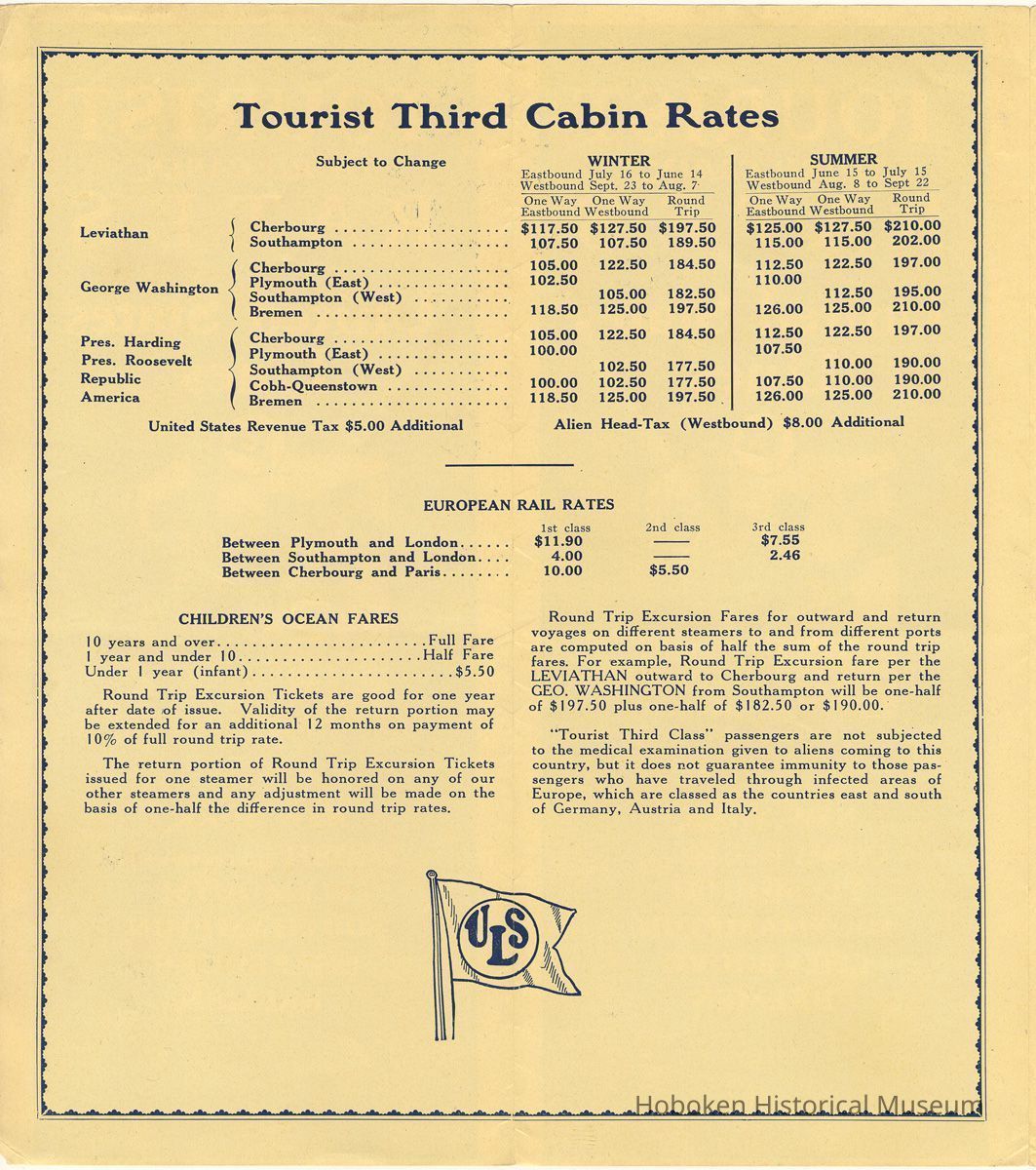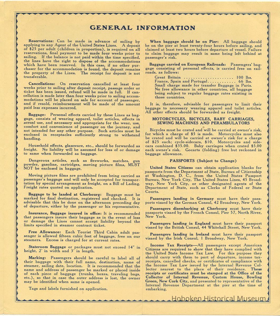 Notes: Selected text from archives 2013.005.0062 ==== [cover title, page 1 - front and back panel are same as folded] Tourist Third Cabin Rates United States Lines New York COBH (Queenstown) Plymouth Southampton Cherbourg Bremen [code at top] No. 5 - Dec. 6, 1927 ===== [page 2]; note prices fare in table have not been transcribed Tourist Third Cabin Rates Leviathan George Washington Pres. Harding Pres. Roosevelt Republic America Cherbourg.......... Southampton........ Cherbourg.......... Plymouth (East)..... Southampton (West) Bremen ............ Cherbourg.......... Plymouth (East)..... Southampton (West) . Cobh-Queenstown . . . . Bremen WINTER Eastbound July 16 to June 14 Westbound Sept. 23 to Aug. 7 One Way One Way Round Eastbound Westbound Trip SUMMER Eastbound June 15 to July 15 Westbound Aug. 8 to Sept 22 One Way One Way Round Eastbound Westbound Trip United States Revenue Tax $5.00 Additional Alien Head-Tax (Westbound) $8.00 Additional EUROPEAN RAIL RATES 1st class 2nd class 3rd class Between Plymouth and London... $11.90 --$7.55 Between Southampton and London. . . . 4.00 --2.46 Between Cherbourg and Paris........ 10.00 $5.50 CHILDREN'S OCEAN FARES 10 years and over........................Full Fare 1 year and under 10.....................Half Fare Under 1 year (infant).......................$5.50 Round Trip Excursion Tickets are good for one year after date of issue. Validity of the return portion may be extended for an additional 12 months on payment of 10% of full round trip rate. The return portion of Round Trip Excursion Tickets issued for one steamer will be honored on any of our other steamers and any adjustment will be made on the basis of one-half the difference in round trip rates. ---- Round Trip Excursion Fares for outward and return voyages on different steamers to and from different ports are computed on basis of half the sum of the round trip fares. For example, Round Trip Excursion fare per the LEVIATHAN outward to Cherbourg and return per the GEO. WASHINGTON from Southampton will be one-half of $197.50 plus one-half of $182.50 or $190.00. "Tourist Third Class" passengers are not subjected to the medical examination given to aliens coming to this country, but it does not guarantee immunity to those passengers who have traveled through infected areas of Europe, which are classed as the countries east and south of Germany, Austria and Italy. ===== [page 3] GENERAL INFORMATION Reservations: Can be made in advance of sailing by applying to any Agent of the United States Lines. A deposit of $25 per adult (children in proportion), is required on all reservations, final payment to be made four weeks prior to sailing. If the balance is not paid within the time specified, the lines have the right to dispose of the accommodations which have been reserved. In this case, if no other purchaser for the accommodation is found, the deposit remains the property of the Lines. The receipt for deposit is not transferable. Cancellations: On reservation cancelled at least four weeks prior to sailing after deposit receipt, passage order or ticket has been issued, refund will be made in full. If cancellation is made later than four weeks prior to sailing accommodations will be placed on sale for account of passenger, and if resold, reimbursement will be made of the amount paid less expenses incurred. Baggage: Personal effects carried by these Lines as baggage, consists of wearing apparel, toilet articles, effects in actual use, and necessary and appropriate for the wear, use, comfort and convenience of passenger on the journey, and not intended for any other purpose. Such articles must be enclosed in receptacles sufficiently strong to withstand handling. Household effects, glassware, etc., should be forwarded as freight. No liability will be assumed for loss of or damage to same when forwarded as baggage. Dangerous articles, such as fireworks, matches, gun powder, gasoline, cartridges, moving picture films, MUST NOT be enclosed in baggage. Moving picture films are prohibited from being carried as passenger's baggage and will only be accepted for transportation by special arrangement as freight, on a Bill of Lading. Freight rates quoted on application. Baggage to be landed at Cherbourg: Baggage must be marked for final destination, registered and checked. It is advisable that this be done on the afternoon preceding day of departure, either by the passenger or his representative. Insurance, Baggage insured in office: It is recommended that passengers insure their baggage as in the event of loss or damage the Lines cannot accept liability beyond the limits specified in steamer contract ticket. Free Allowance: Each Tourist Third Cabin adult passenger is allowed fifteen cubic feet of baggage, free on our steamers. Excess is charged for at current rates. Stateroom Baggage or packages must not exceed 14" in height, 2' in width and 3' in length. Marking: Passengers should be careful to label all of their baggage with their full name, destination, name of steamer, sailing date, location. It is recommended that the name and address of passenger be marked or placed inside of each piece of baggage (trunks, boxes, traveling bags, etc.), so that in case the outer address is lost, the owner may be identified when same is opened. Tags and labels furnished on application. When baggage should be on Pier: All baggage should be on the pier at least twenty-four hours before sailing, and claimed at least two hours before departure of vessel. Failure to claim baggage may result in same being left behind at passenger's risk. Baggage carried on European Railroads: Passengers' baggage consisting of personal effects, is carried free on railroads, as follows: Great Britain ..................... 100 lbs. France, Spain and Portugal............ 66 lbs. Small charge made for transfer Baggage in Paris. No free allowance in other countries, all baggage being subject to regular baggage rates existing in those countries. It i