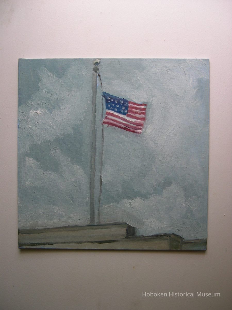 Notes: Notes written by Curran and sent to Museum collections along with the digital image files: Well it begins taking in my plants from the outside ledge. Hurricane Sunflowers is the photo 070, 071, also On that Monday afternoon, October 29, I took in my AC, soon after that I heard a snap outside and I looked out the window and the tree had falled right in the middle of the block. On First St. between Bloomfield and Garden. I think it was one of the first to fall, 051, 056 for city workers were soon there to take care of it. 092,093 is of the clean up after wards. Also on Nov1st, I went out to city hall and painted the Flag Still Standing 202 that is on top of old bank now Walgreens. I felt so guilty painting when all others were helping in the community.Friends of the museums told me to keep painting, you are doing service. I have two more images to send thanks Bill ---- August 22 For me the storm started on Monday Night Oct 29th. Seascape#169 I was painting on an oil painting and i just completed a part of water in a seascape, it was 915pm and i stood back and said i like that... all of a sudden the lights went out. I have a habit of ruining something after i like what i just did. So in a way it was a blessing that i could not touch it. so i lay down my paint brushes and what followed was one week of night living by candle light. The Storm reminded me of a blizzard except there was no snow, just black at night. It was very interesting thought to see folks walking down the street from my apt windows and casting these circular white shapes on the sidewalk from their flashlights as they strolled the evening in darkness. Also one night when i came home from St Peter and Paul's Church which i think never lost power , i stood on my front steps before retiring and i saw the stars on the corner of Bloomfield Street and First like i have never before. The sky was so dark blue and millions it seemed of stars were above my head. That was breathtaking. One week after Sandy, we had a Nor'easter, Tree,#185 oil on canvas, was done while nor'easter was belting snow and ice. I regret not shooting more photos, especially of City hall, with the Armed forces there. It was like MASH but just more intense. Rebuilding Hoboken#247, oil on canvas was painted on Garden street in the Spring. Folks were starting to repair what had been damaged from Sandy. Just as i started working on this painting the workmen too the wood leaning against the building away. note: the flag painting sent prior is oil on canvas board, all works are in my collection. ==== ==== Original or Copy: Digital copy Status: OK Status By: dw Status Date: 2014-09-26