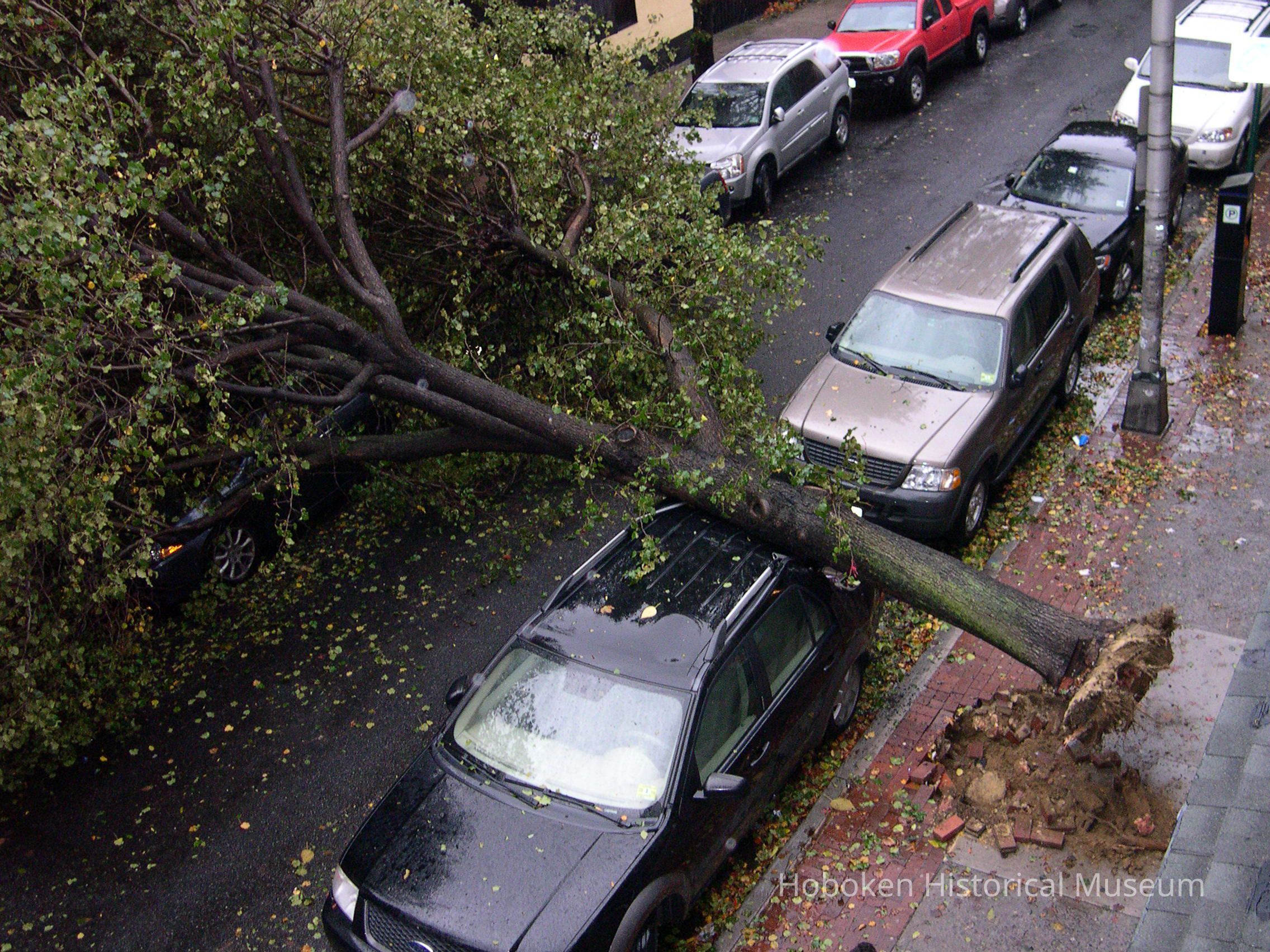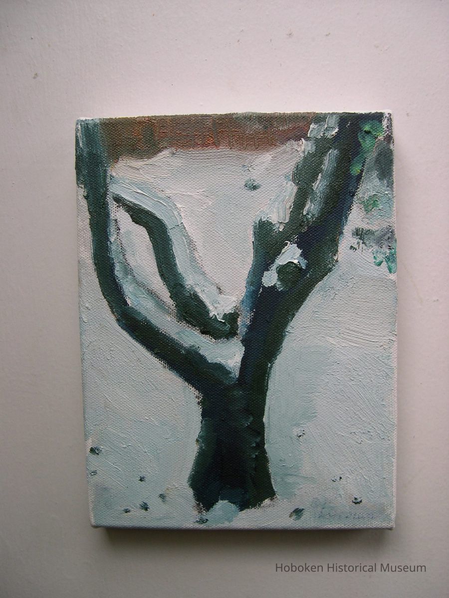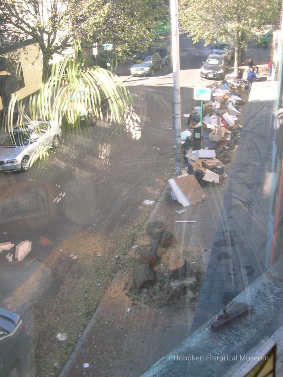 Notes: Notes written by Curran and sent to Museum collections along with the digital image files: Well it begins taking in my plants from the outside ledge. Hurricane Sunflowers is the photo 070, 071, also On that Monday afternoon, October 29, I took in my AC, soon after that I heard a snap outside and I looked out the window and the tree had falled right in the middle of the block. On First St. between Bloomfield and Garden. I think it was one of the first to fall, 051, 056 for city workers were soon there to take care of it. 092,093 is of the clean up after wards. Also on Nov1st, I went out to city hall and painted the Flag Still Standing 202 that is on top of old bank now Walgreens. I felt so guilty painting when all others were helping in the community.Friends of the museums told me to keep painting, you are doing service. I have two more images to send thanks Bill ---- August 22 For me the storm started on Monday Night Oct 29th. Seascape#169 I was painting on an oil painting and i just completed a part of water in a seascape, it was 915pm and i stood back and said i like that... all of a sudden the lights went out. I have a habit of ruining something after i like what i just did. So in a way it was a blessing that i could not touch it. so i lay down my paint brushes and what followed was one week of night living by candle light. The Storm reminded me of a blizzard except there was no snow, just black at night. It was very interesting thought to see folks walking down the street from my apt windows and casting these circular white shapes on the sidewalk from their flashlights as they strolled the evening in darkness. Also one night when i came home from St Peter and Paul's Church which i think never lost power , i stood on my front steps before retiring and i saw the stars on the corner of Bloomfield Street and First like i have never before. The sky was so dark blue and millions it seemed of stars were above my head. That was breathtaking. One week after Sandy, we had a Nor'easter, Tree,#185 oil on canvas, was done while nor'easter was belting snow and ice. I regret not shooting more photos, especially of City hall, with the Armed forces there. It was like MASH but just more intense. Rebuilding Hoboken#247, oil on canvas was painted on Garden street in the Spring. Folks were starting to repair what had been damaged from Sandy. Just as i started working on this painting the workmen too the wood leaning against the building away. note: the flag painting sent prior is oil on canvas board, all works are in my collection. ==== ==== Original or Copy: Digital copy Status: OK Status By: dw Status Date: 2014-09-26