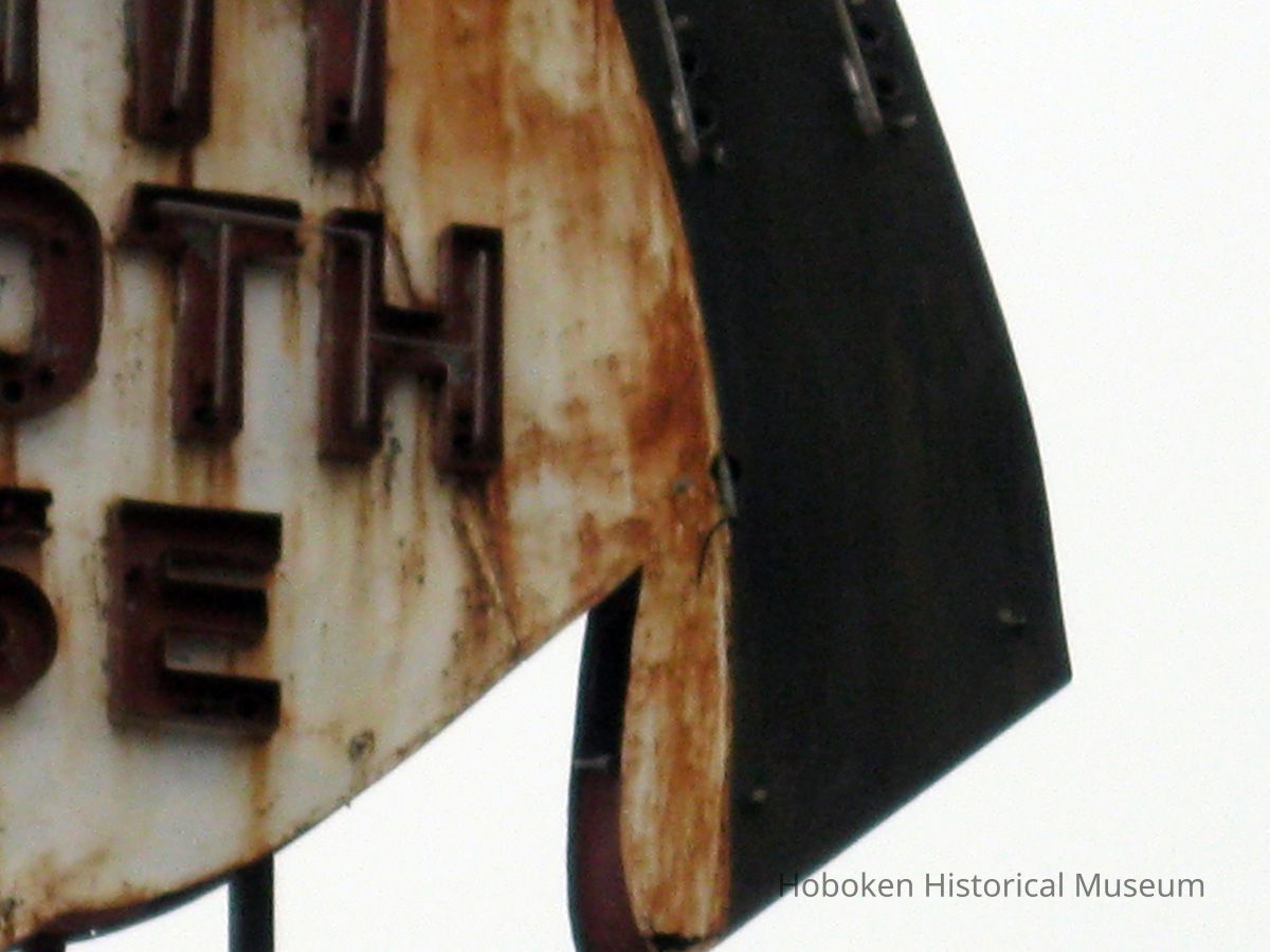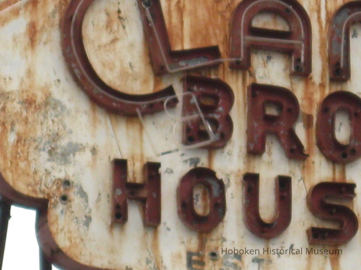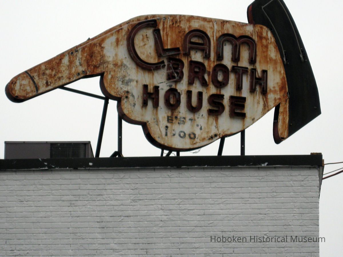 --Clam Broth House sign on roof at corner of Newark and River Street (sign survived, but some damage is seen)