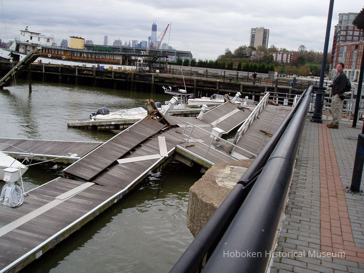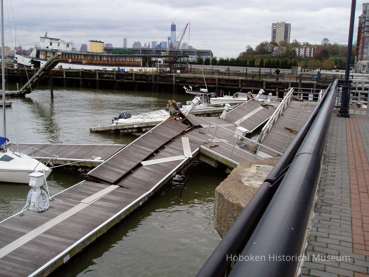 Color photos, 9, of damage from Hurricane Sandy to Hoboken Marina, Nov. 2, 2012.