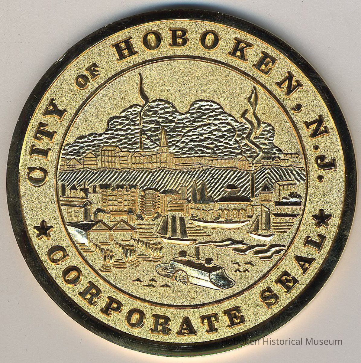 Heavy metal, composition not known, with bright gold finish, scant 3-1/16" diameter x 5/32" thick. Text as above on front with two ships; reverse has City of Hoboken Corporate Seal.
