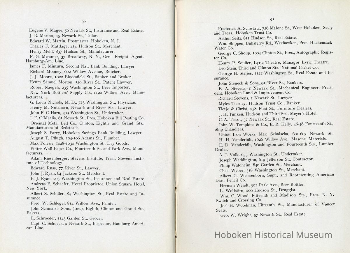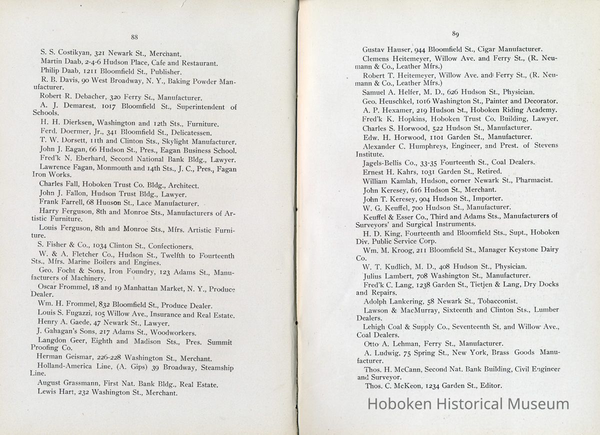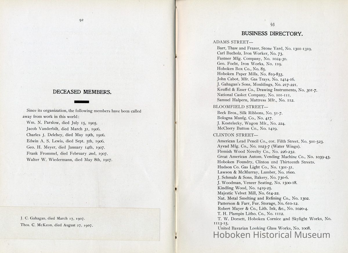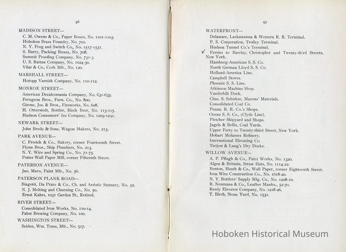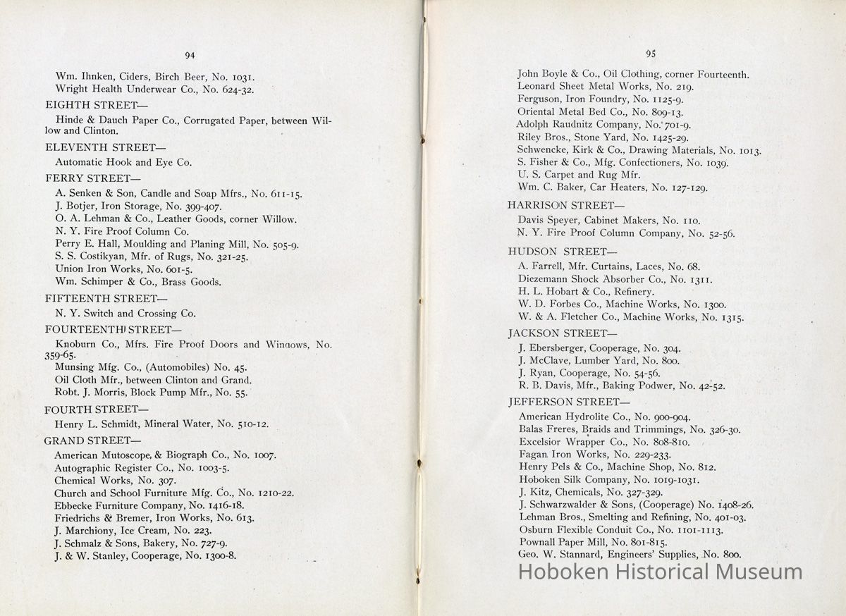 Display Value: Good Notes: Text of listings found in "Business Directory" on page 93-97. Businesses alphabetically by street or general location, i.e. Waterfront, and alphabetically within the area by first letter (sometimes the first initial of a name.) ADAMS STREET- Barr, Thaw and Frazer, Stone Yard, No. 1301 - 1319. Carl Bucholz, Iron Worker, No. 73. Fastner Mfg. Company, No. 1024 - 30. George Focht, Iron Works, No. 119. Hoboken Box Co., No. 85. Hoboken Paper Mills, No. 819 - 833. John Cabot, Mfr, Gas Trays, No. 1414-16. J. Gahagan's Sons, Mouldings, No. 217-221. Keuffel & Esser Co., Drawing Instruments, No. 301 - 307. National Casket Company, No. 101 - 111 Samuel Halpern, Mattress Mfr., No. 112. BLOOMFIELD STREET- Beck Bros., Silk Ribbons, No. 51 - 57. Bologna Manfg. Co., No. 417. J. Kostelecky, Wagon Mfr., No. 224. McCleery Button Co., No. 1419. CLINTON STREET- American Lead Pencil Co., cor[ner]. Fifth Street, No. 501 - 523. Ayvad Mfg. Co., No. 1023 -1027 (Water Wings). Flemish Wood Novelty Co., No. 226 - 232. Great American Autom. Vending Machine Co., No. 1039 - 1043. Hoboken Foundry, Clinton and Thirteenth Streets. Hudson County Gas Light Co., No. 1301 - 31. Lawson & McMurray, Lumber, No. 1000. J. Schmalz & Sons, Bakery, No. 730 - 736. J. Woodman, Veneer Seating, No. 1500 - 1518. Kindling Wood, No. 1419 - 25. Majestic Velvet Mill, No. 614 - 22. National Metal Smelting and Refining Co., No. 1302. Patterson & Farr, Furniture Storage, No. 610 - 612. Robert Mayer & Co., Lith. Ink, &c., No. 1020 -1024. T. H. Plampin Litho. Co., No. 1112. T. W. Dorsett, Hoboken Cornice and Skylight Works, No. 1113 - 1115. United Bavarian Looking Glass Works, No. 1008. Wm. [William or Wilhelm] Ihnken, Ciders, Birch Beer, No. 1031. Wright Health Underwear Co., No. 624 - 632. EIGHTH STREET- Hinde & Dauch Paper Co., Corrugated Paper, between Willow and Clinton. ELEVENTH STREET- Automatic Hook and Eye Co. FERRY STREET- A. Senken & Son, Candle and Soap Mfrs., No. 611 - 615. J. Botjer, Iron Storage, No. 399 - 407. O. A. Lehman & Co., Leather Goods, corner Willow. N. Y. Fire Proof Column Co. Perry E. Hall, Moulding and Planing Mill, No. 505 - 509. S. S. Costikyan, Mfr. of Rugs, No. 321 - 325. Union Iron Works, No. 601 - 605. Wm.[William or Wilhelm] Schimper & Co., Brass Goods. FIFTEENTH STREET- N. Y. Switch and Crossing Co. FOURTEENTH STREET- Knoburn Co., Mfrs. Fire Proof Doors and Windows, No. 359 - 365. Munsing Mfg. Co., (Automobiles) No. 45. Oil Cloth Mfr., between Clinton and Grand. Robt.[Robert] J. Morris, Block Pump Mfr., No. 55. FOURTH STREET- Henry L. Schmidt, Mineral Water, No. 510 -512. GRAND STREET- American Mutoscope & Biograph Co., No. 1007. Autographic Register Co., No. 1003 - 1005. Chemical Works, No. 307. Church and School Furniture Mfg. Co., No. 1210 - 1222. Ebbecke Furniture Company, No. 1416 - 1418. Friedrichs & Bremer, Iron Works, No. 613. J. Marchiony, Ice Cream, No. 223. J. Schmalz & Sons, Bakery, No. 727 - 729. J. & W. Stanley, Cooperage, No. 1300 - 1308. John Boyle & Co., Oil Clothing, corner Fourteenth. Leonard Sheet Metal Works, No. 219. Ferguson, Iron Foundry, No. 1125 - 1129. Oriental Metal Bed Co., No. 809 - 813. Adolph Raudnitz Company, No. 701 - 709. Riley Bros., Stone Yard, No. 1425 - 1429. Schwencke, Kirk & Co., Drawing Materials, No. 1013. S. Fisher & Co., Mfg. Confectioners, No. 1039. U. S. Carpet and Rug Mfr. Wm.[William] C. Baker, Car Heaters, No. 127 - 129. HARRISON STREET- Davis Speyer, Cabinet Makers, No. 110. N. Y. Fire Proof Column Company, No. 52 - 56. HUDSON STREET- A. Farrell, Mfr. Curtains, Laces, No. 68. Diezemann Shock Absorber Co., No. 1311. H. L. Hobart & Co., Refinery. W. D. Forbes Co., Machine Works, No. 1300. W. & A. Fletcher Co., Machine Works, No. 1315. JACKSON STREET- J. Ebersberger, Cooperage, No. 304. J. McClave, Lumber Yard, No. 800. J. Ryan, Cooperage, No. 54 - 56. R. B. Davis, Mfr., Baking Powder, No. 42 - 52. JEFFERSON STREET- American Hydrolite Co., No. 900 - 904. Balas Freres, Braids and Trimmings, No. 326 - 330. Excelsior Wrapper Co., No. 808 - 810. Fagan Iron Works, No. 229 - 233. Henry Pels & Co., Machine Shop, No. 812. Hoboken Silk Company, No. 1019 - 1031. J. Kitz, Chemicals, No. 327 - 329. J. Schwarzwalder & Sons, (Cooperage) No. 1408 - 1426. Lehman Bros., Smelting and Refining, No. 401 - 403. Osburn Flexible Conduit Co., No. 1101 - 1113. Pownall Paper Mill, No. 801 - 815. Geo.[George] W. Stannard, Engineers' Supplies, No. 800. MADISON STREET- C. M. Owens & Co., Paper Boxes, No. 1101 - 1103. Hoboken Brass Foundry, No. 700. N. Y. Frog and Switch Co., No. 1517 - 1531. S. Barry, Packing Boxes, No. 708. Summit Proofing Company, No. 731 - 733. U. S. Rattan Company, No. 1024 - 1030. Vilar & Co., Cork Mfr., No. 120. MARSHALL STREET- Hotopp Varnish Company. No. 110 - 112. MONROE STREET- American Decalcomania Company, No. 631 - 633. Ferugson Bros., Furn.[Furniture] Co., No. 8oo. Girone, Jos.[Joseph] & Bros., Fireworks, No. 6o8. H. Otterstedt, Bottler, Birch Beer, No. 113 - 115. Hudson Consumers' Ice Company, No. 1209 - 1231. NEWARK STREET- John Brede, & Sons, Wagon Makers, No. 213. PARK AVENUE- C. French & Co., Bakery, corner Fourteenth Street. Flynn Bros., Ship Plumbers, No. 213. N. Y. Wire and Spring Co., No. 71 - 75. Potter Wall Paper [wallpaper] Mill, corner Fifteenth Street. PATERSON AVENUE- Jno. Marx, Paint Mfr., No. 56. PATERSON PLANK ROAD- Biagotti, Da. Prato & Co., Ch.[Church] and Artistic Statuary, No. 52. N. J. Melting and Churning Co., No. 50. Ernst Kahrs, 1031 Garden St., Retired. RIVER STREET- Consolidated Iron Works, No. 110 -114. Pabst Brewing Company, No. 100. WASHINGTON STREET- Seiden, Wm.[William] Truss, Mfr., No. 517. WATERFRONT- Delaware, Lackawanna & Western R. R. Terminal. P. S.[Public Service] Corporation, Trolley Terminal. Hudson Tunnel Co.'s Terminal. [Hudson & Manhattan Railroad] Ferries to Barclay, Christopher and Twenty-third Streets, New York. Hamburg-American S. S.[Steamship] Co. North German Lloyd S. S.[Steamship] Co. H