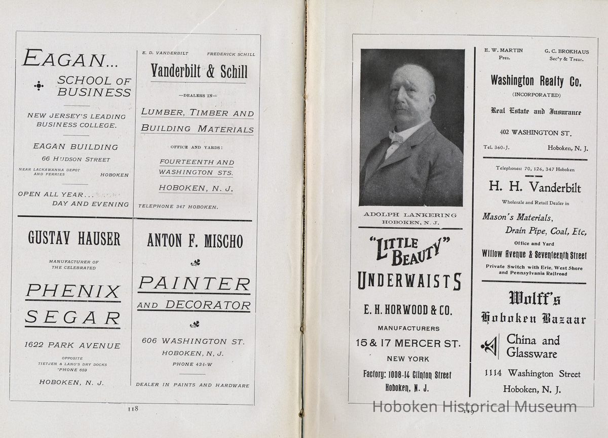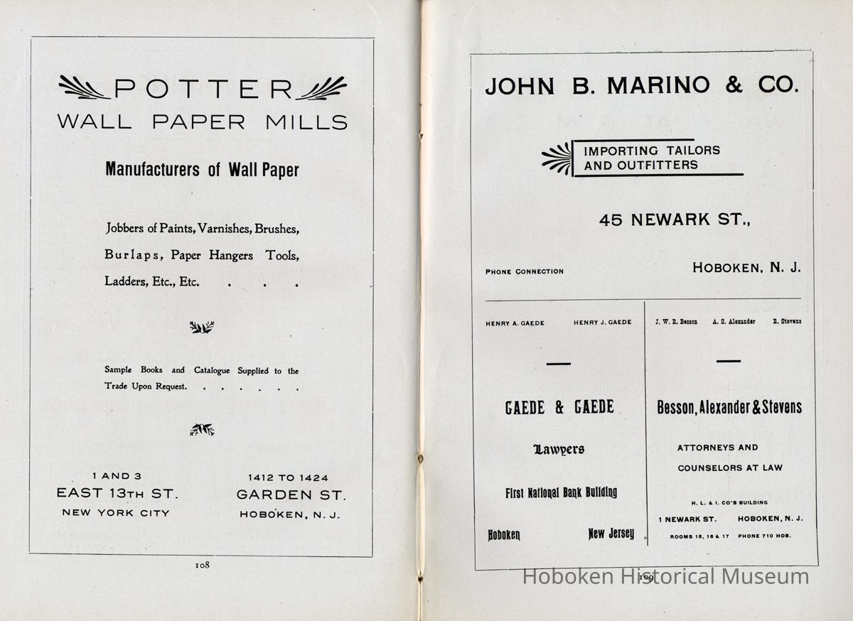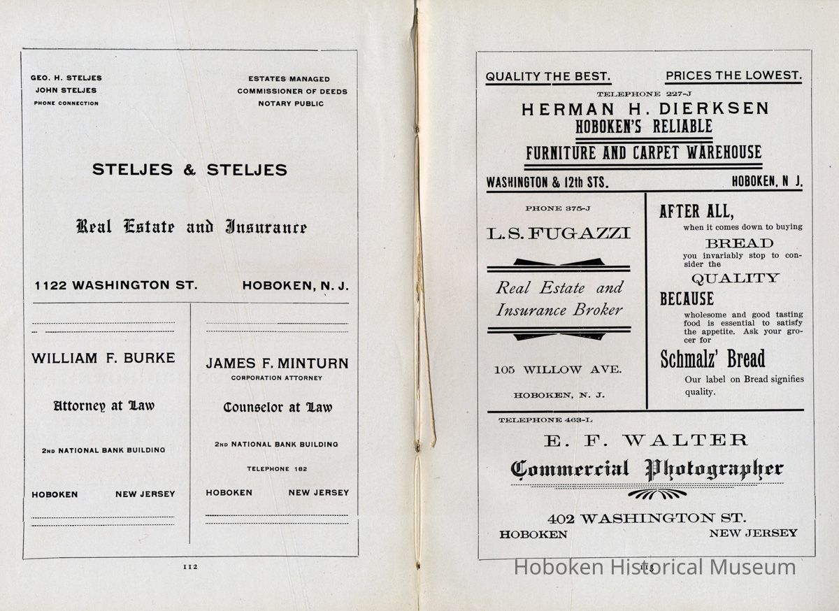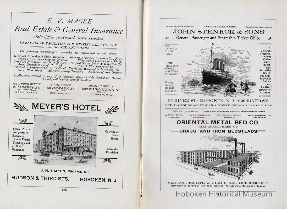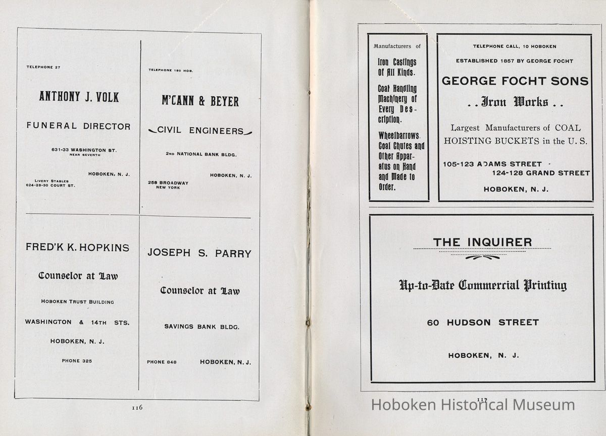 Display Value: Good Notes: Text of listings found in "Business Directory" on page 93-97. Businesses alphabetically by street or general location, i.e. Waterfront, and alphabetically within the area by first letter (sometimes the first initial of a name.) ADAMS STREET- Barr, Thaw and Frazer, Stone Yard, No. 1301 - 1319. Carl Bucholz, Iron Worker, No. 73. Fastner Mfg. Company, No. 1024 - 30. George Focht, Iron Works, No. 119. Hoboken Box Co., No. 85. Hoboken Paper Mills, No. 819 - 833. John Cabot, Mfr, Gas Trays, No. 1414-16. J. Gahagan's Sons, Mouldings, No. 217-221. Keuffel & Esser Co., Drawing Instruments, No. 301 - 307. National Casket Company, No. 101 - 111 Samuel Halpern, Mattress Mfr., No. 112. BLOOMFIELD STREET- Beck Bros., Silk Ribbons, No. 51 - 57. Bologna Manfg. Co., No. 417. J. Kostelecky, Wagon Mfr., No. 224. McCleery Button Co., No. 1419. CLINTON STREET- American Lead Pencil Co., cor[ner]. Fifth Street, No. 501 - 523. Ayvad Mfg. Co., No. 1023 -1027 (Water Wings). Flemish Wood Novelty Co., No. 226 - 232. Great American Autom. Vending Machine Co., No. 1039 - 1043. Hoboken Foundry, Clinton and Thirteenth Streets. Hudson County Gas Light Co., No. 1301 - 31. Lawson & McMurray, Lumber, No. 1000. J. Schmalz & Sons, Bakery, No. 730 - 736. J. Woodman, Veneer Seating, No. 1500 - 1518. Kindling Wood, No. 1419 - 25. Majestic Velvet Mill, No. 614 - 22. National Metal Smelting and Refining Co., No. 1302. Patterson & Farr, Furniture Storage, No. 610 - 612. Robert Mayer & Co., Lith. Ink, &c., No. 1020 -1024. T. H. Plampin Litho. Co., No. 1112. T. W. Dorsett, Hoboken Cornice and Skylight Works, No. 1113 - 1115. United Bavarian Looking Glass Works, No. 1008. Wm. [William or Wilhelm] Ihnken, Ciders, Birch Beer, No. 1031. Wright Health Underwear Co., No. 624 - 632. EIGHTH STREET- Hinde & Dauch Paper Co., Corrugated Paper, between Willow and Clinton. ELEVENTH STREET- Automatic Hook and Eye Co. FERRY STREET- A. Senken & Son, Candle and Soap Mfrs., No. 611 - 615. J. Botjer, Iron Storage, No. 399 - 407. O. A. Lehman & Co., Leather Goods, corner Willow. N. Y. Fire Proof Column Co. Perry E. Hall, Moulding and Planing Mill, No. 505 - 509. S. S. Costikyan, Mfr. of Rugs, No. 321 - 325. Union Iron Works, No. 601 - 605. Wm.[William or Wilhelm] Schimper & Co., Brass Goods. FIFTEENTH STREET- N. Y. Switch and Crossing Co. FOURTEENTH STREET- Knoburn Co., Mfrs. Fire Proof Doors and Windows, No. 359 - 365. Munsing Mfg. Co., (Automobiles) No. 45. Oil Cloth Mfr., between Clinton and Grand. Robt.[Robert] J. Morris, Block Pump Mfr., No. 55. FOURTH STREET- Henry L. Schmidt, Mineral Water, No. 510 -512. GRAND STREET- American Mutoscope & Biograph Co., No. 1007. Autographic Register Co., No. 1003 - 1005. Chemical Works, No. 307. Church and School Furniture Mfg. Co., No. 1210 - 1222. Ebbecke Furniture Company, No. 1416 - 1418. Friedrichs & Bremer, Iron Works, No. 613. J. Marchiony, Ice Cream, No. 223. J. Schmalz & Sons, Bakery, No. 727 - 729. J. & W. Stanley, Cooperage, No. 1300 - 1308. John Boyle & Co., Oil Clothing, corner Fourteenth. Leonard Sheet Metal Works, No. 219. Ferguson, Iron Foundry, No. 1125 - 1129. Oriental Metal Bed Co., No. 809 - 813. Adolph Raudnitz Company, No. 701 - 709. Riley Bros., Stone Yard, No. 1425 - 1429. Schwencke, Kirk & Co., Drawing Materials, No. 1013. S. Fisher & Co., Mfg. Confectioners, No. 1039. U. S. Carpet and Rug Mfr. Wm.[William] C. Baker, Car Heaters, No. 127 - 129. HARRISON STREET- Davis Speyer, Cabinet Makers, No. 110. N. Y. Fire Proof Column Company, No. 52 - 56. HUDSON STREET- A. Farrell, Mfr. Curtains, Laces, No. 68. Diezemann Shock Absorber Co., No. 1311. H. L. Hobart & Co., Refinery. W. D. Forbes Co., Machine Works, No. 1300. W. & A. Fletcher Co., Machine Works, No. 1315. JACKSON STREET- J. Ebersberger, Cooperage, No. 304. J. McClave, Lumber Yard, No. 800. J. Ryan, Cooperage, No. 54 - 56. R. B. Davis, Mfr., Baking Powder, No. 42 - 52. JEFFERSON STREET- American Hydrolite Co., No. 900 - 904. Balas Freres, Braids and Trimmings, No. 326 - 330. Excelsior Wrapper Co., No. 808 - 810. Fagan Iron Works, No. 229 - 233. Henry Pels & Co., Machine Shop, No. 812. Hoboken Silk Company, No. 1019 - 1031. J. Kitz, Chemicals, No. 327 - 329. J. Schwarzwalder & Sons, (Cooperage) No. 1408 - 1426. Lehman Bros., Smelting and Refining, No. 401 - 403. Osburn Flexible Conduit Co., No. 1101 - 1113. Pownall Paper Mill, No. 801 - 815. Geo.[George] W. Stannard, Engineers' Supplies, No. 800. MADISON STREET- C. M. Owens & Co., Paper Boxes, No. 1101 - 1103. Hoboken Brass Foundry, No. 700. N. Y. Frog and Switch Co., No. 1517 - 1531. S. Barry, Packing Boxes, No. 708. Summit Proofing Company, No. 731 - 733. U. S. Rattan Company, No. 1024 - 1030. Vilar & Co., Cork Mfr., No. 120. MARSHALL STREET- Hotopp Varnish Company. No. 110 - 112. MONROE STREET- American Decalcomania Company, No. 631 - 633. Ferugson Bros., Furn.[Furniture] Co., No. 8oo. Girone, Jos.[Joseph] & Bros., Fireworks, No. 6o8. H. Otterstedt, Bottler, Birch Beer, No. 113 - 115. Hudson Consumers' Ice Company, No. 1209 - 1231. NEWARK STREET- John Brede, & Sons, Wagon Makers, No. 213. PARK AVENUE- C. French & Co., Bakery, corner Fourteenth Street. Flynn Bros., Ship Plumbers, No. 213. N. Y. Wire and Spring Co., No. 71 - 75. Potter Wall Paper [wallpaper] Mill, corner Fifteenth Street. PATERSON AVENUE- Jno. Marx, Paint Mfr., No. 56. PATERSON PLANK ROAD- Biagotti, Da. Prato & Co., Ch.[Church] and Artistic Statuary, No. 52. N. J. Melting and Churning Co., No. 50. Ernst Kahrs, 1031 Garden St., Retired. RIVER STREET- Consolidated Iron Works, No. 110 -114. Pabst Brewing Company, No. 100. WASHINGTON STREET- Seiden, Wm.[William] Truss, Mfr., No. 517. WATERFRONT- Delaware, Lackawanna & Western R. R. Terminal. P. S.[Public Service] Corporation, Trolley Terminal. Hudson Tunnel Co.'s Terminal. [Hudson & Manhattan Railroad] Ferries to Barclay, Christopher and Twenty-third Streets, New York. Hamburg-American S. S.[Steamship] Co. North German Lloyd S. S.[Steamship] Co. H