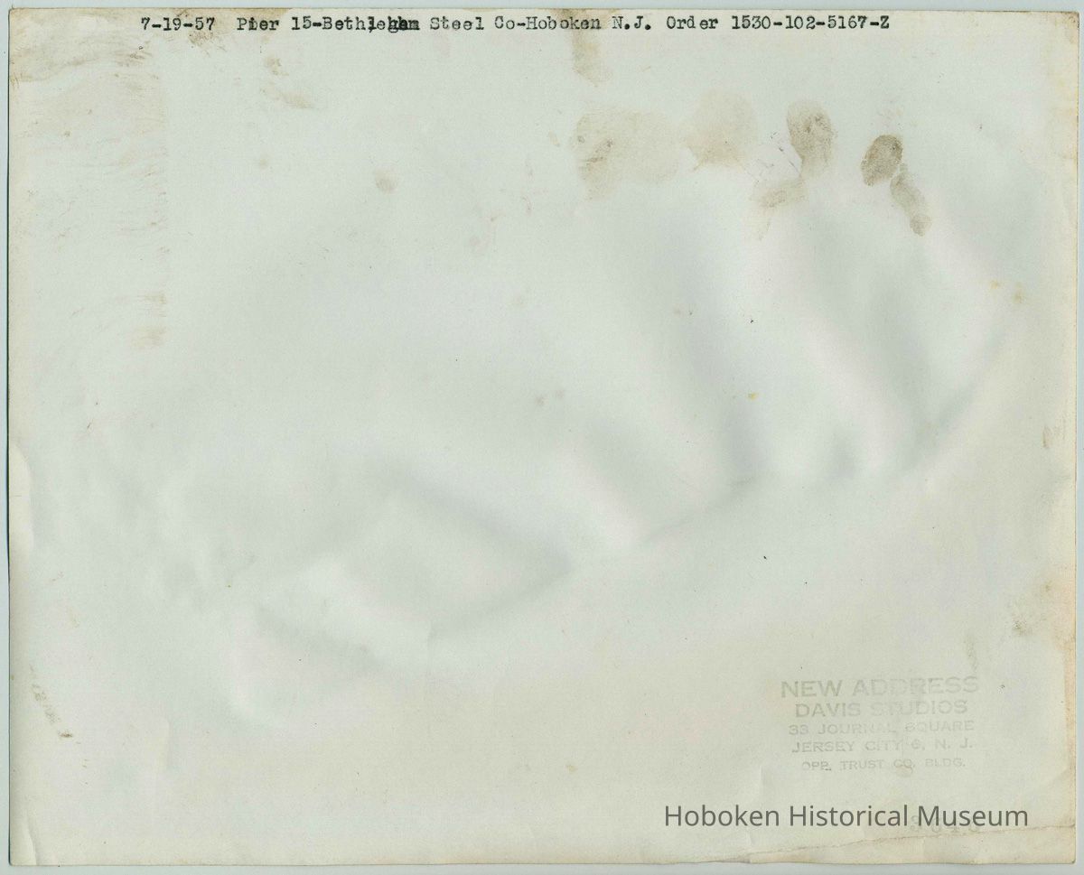 Black-and-white photo of the reconstruction and extension of Pier 15 at the Bethlehem Steel Shipyard, Hoboken Division, July 19, 1957. Photo was taken by Davis Studios.This view is looking towards the northeast with New York City in the hazy background. The moored vessel is not identified. A derrick barge is at the right.