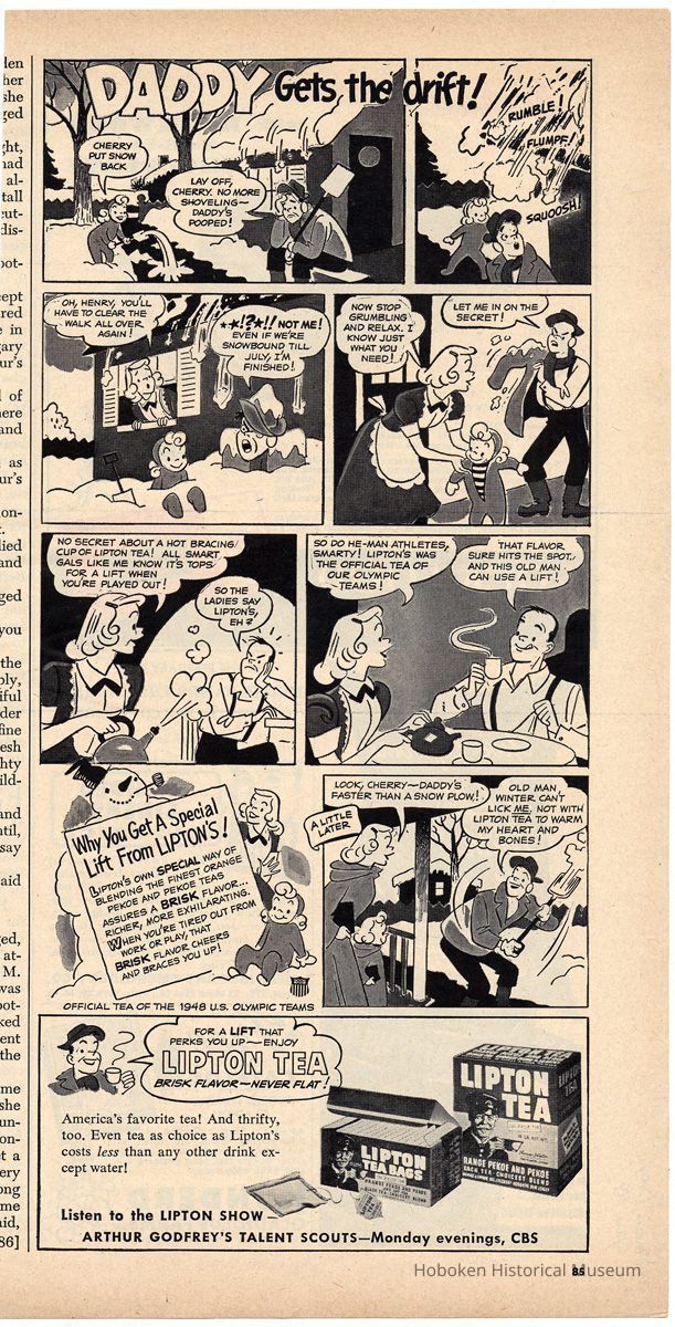 Ads, magazine: Lipton Tea, two comic style ads from 1949 women's magazines.