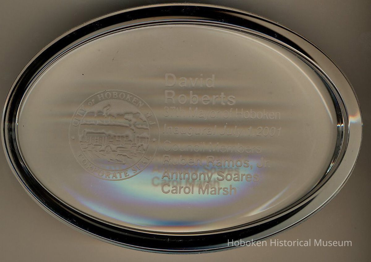 Commemorative paperweight: David Roberts, 37th Mayor of Hoboken, Inaugural July 1, 2001. Council Members, Ruben Ramos, Jr., Anthony Soares, Carol Marsh. Issued Hoboken, 2001. Clear glass, oval 4" wide x 2-11/16" high x 13/16" thick with recessed bottom with engraved text as above.