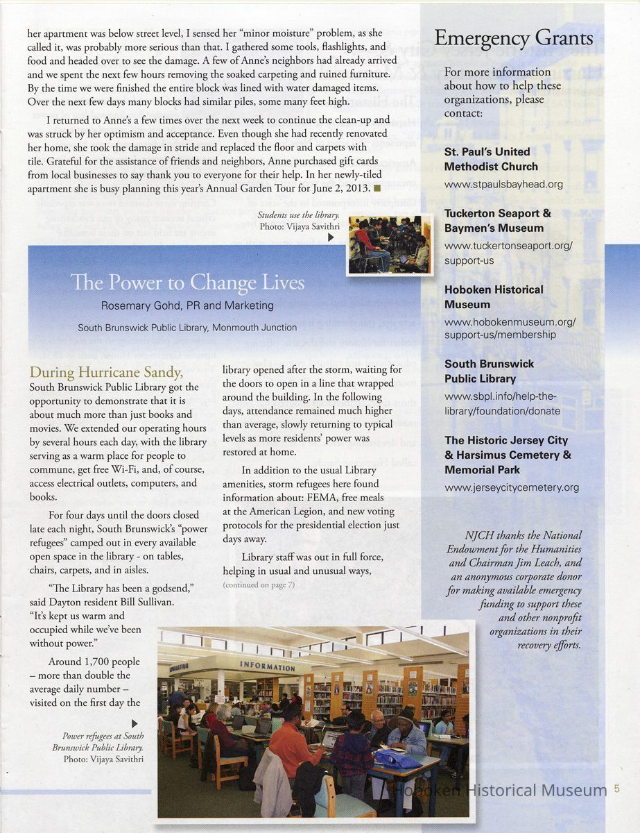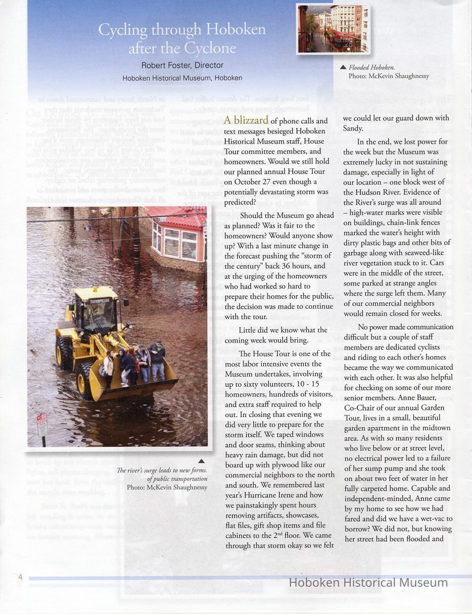 Notes: Archives 2013.002.0007 ==== page 4 Cycling through Hoboken after the Cyclone. Robert Foster, Director Hoboken Historical Museum, Hoboken A blizzard of phone calls and text messages besieged Hoboken Historical Museum staff, House Tour committee members, and homeowners. Would we still hold our planned annual House Tour on October 27 even though a potentially devastating storm was predicted? Should the Museum go ahead as planned? Was it fair to the homeowners? Would anyone show up? With a last minute change in the forecast pushing the "storm of the century" back 36 hours, and at the urging of the homeowners who had worked so hard to prepare their homes for the public, the decision was made to continue with the tour. Little did we know what the coming week would bring. The House Tour is one of the most labor intensive events the Museum undertakes, involving up to sixty volunteers, 10-15 homeowners, hundreds of visitors, and extra staff required to help out. In closing that evening we did very little to prepare for the storm itself. We taped windows and door seams, thinking about heavy rain damage, but did not board up with plywood like our commercial neighbors to the north and south. We remembered last year's Hurricane Irene and how we painstakingly spent hours removing artifacts, showcases, flat files, gift shop items and file cabinets to the 2nd floor. We came through that storm okay so we felt we could let our guard down with Sandy. In the end, we lost power for the week but the Museum was extremely lucky in not sustaining damage, especially in light of our location - one block west of the Hudson River. Evidence of the River's surge was all around - high-water marks were visible on buildings, chain-link fences marked the water's height with dirty plastic bags and other bits of garbage along with seaweed-like river vegetation stuck to it. Cars were in the middle of the street, some parked at strange angles where the surge left them. Many of our commercial neighbors would remain closed for weeks. No power made communication difficult but a couple of staff members are dedicated cyclists and riding to each other's homes became the way we communicated with each other. It was also helpful for checking on some of our more senior members. Anne Bauer, Co-Chair of our annual Garden Tour, lives in a small, beautiful garden apartment in the midtown area. As with so many residents who live below or at street level, no electrical power led to a failure of her sump pump and she took on about two feet of water in her fully carpeted home. Capable and independent-minded, Anne came by my home to see how we had fared and did we have a wet-vac to borrow? We did not, but knowing her street had been flooded and ---- [caption page 4 top right photo] A. Flooded Hoboken. Photo: McKevin Shaughnessy ---- [caption page 4 bottom left photo] The river's surge leads to new forms of public transportation. Photo: McKevin Shaughnessy ==== page 5 er apartment was below street level, I sensed her "minor moisture" problem, as she called it, was probably more serious than that. I gathered some tools, flashlights, and food and headed over to see the damage. A few of Anne's neighbors had already arrived and we spent the next few hours removing the soaked carpeting and ruined furniture. By the time we were finished the entire block was lined with water damaged items. Over the next few days many blocks had similar piles, some many feet high. I returned to Anne's a few times over the next week to continue the clean-up and was struck by her optimism and acceptance. Even though she had recently renovated her home, she took the damage in stride and replaced the floor and carpets with tile. Grateful for the assistance of friends and neighbors, Anne purchased gift cards from local businesses to say thank you to everyone for their help. In her newly-tiled apartment she is busy planning this year's Annual Garden Tour for June 2, 2013. [end Foster article] ==== ==== Status: OK Status By: dw Status Date: 2013-04-24