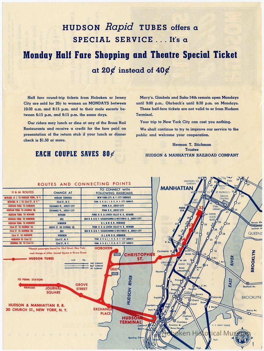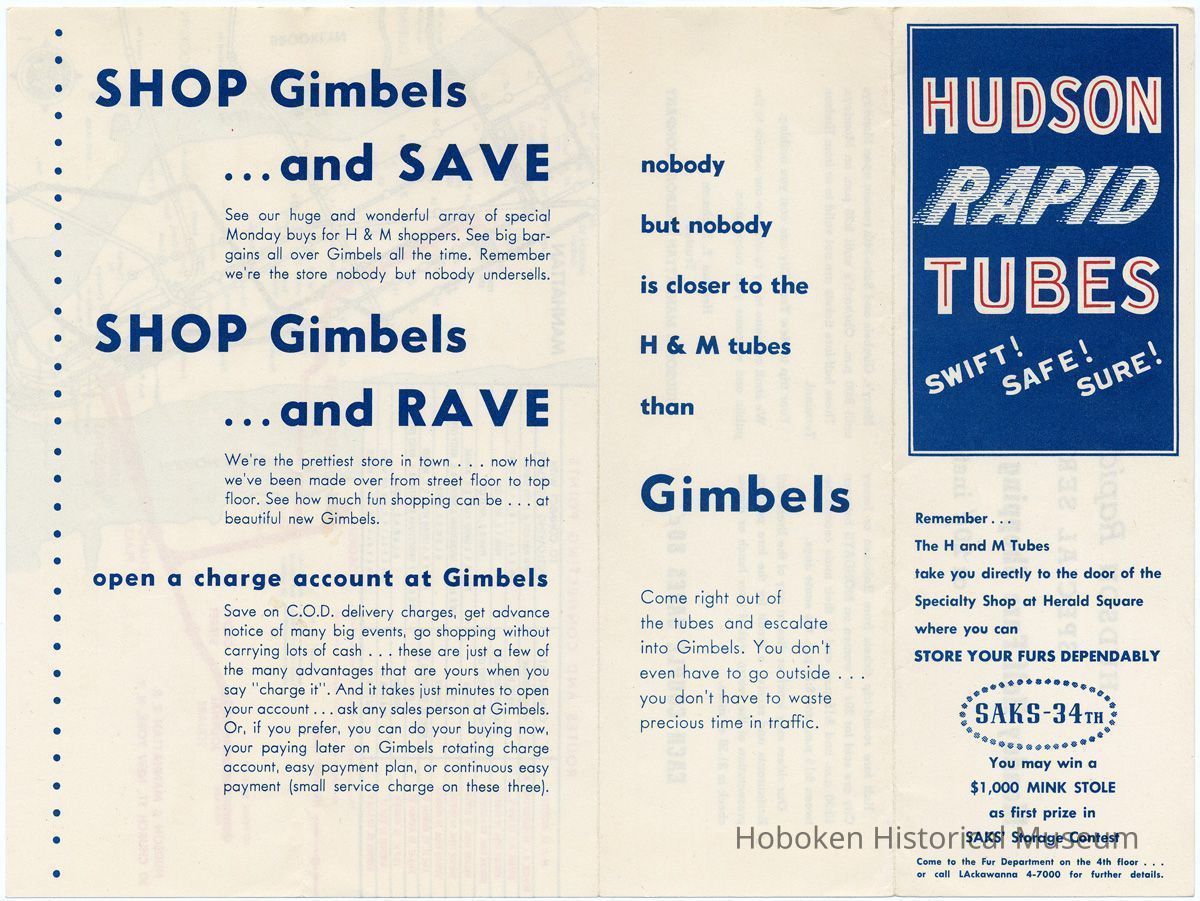 Notes: Archives 2013.005.0108 ---- [side 1] Hudson Rapid Tubes. Swift! Safe! Sure! Remember. .. The H and M Tubes take you directly to the door of the Specialty Shop at Herald Square where you can STORE YOUR FURS DEPENDABLY SAKS34th You may win a $1,000 MINK STOLE as first prize in SAKS' Storage Contest Come to the Fur Department on the 4th floor . . . or call LAckawanna 4-7000 for further details. ---- nobody but nobody is closer to the H & M tubes than Gimbels Come right out of the tubes and escalate into Gimbels. You don't even have to go outside ... you don't have to waste precious time in traffic. ---- SHOP Gimbels ... and SAVE See our huge and wonderful array of special Monday buys for H & M shoppers. See big bargains all over Gimbels all the time. Remember we're the store nobody but nobody undersells. SHOP Gimbels ...and RAVE We're the prettiest store in town . . . now that we've been made over from street floor to top floor. See how much fun shopping can be ... at beautiful new Gimbels. open a charge account at Gimbels Save on C.O.D. delivery charges, get advance notice of many big events, go shopping without carrying lots of cash . . . these are just a few of the many advantages that are yours when you say "charge it". And it takes just minutes to open your account. . . ask any sales person at Gimbels. Or, if you prefer, you can do your buying now, your paying later on Gimbels rotating charge account, easy payment plan, or continuous easy payment (small service charge on these three). [end side 1] --- [side 2] HUDSON Rapid TUBES offers a SPECIAL SERVICE . . . It's a Monday Hall Fare Shopping and Theatre Special Ticket at 20¢ instead of 40¢ Half fare round-trip tickets from Hoboken or Jersey City are sold for 20¢ to women on MONDAYS between 10:30 a.m. and 8:15 p.m. and to their male escorts between 6:15 p.m. and 8:15 p.m. the same days. Our riders may lunch or dine at any of the Brass Rail Restaurants and receive a credit for the fare paid on presentation of the return stub if your lunch or dinner check is $1.50 or more. EACH COUPLE SAVES 80¢ Macy's, Gimbels and Saks-34th remain open Mondays until 9:00 p.m.. Ohrbach's until 8:30 p.m. on Mondays. These half-fare tickets are not valid to or from Hudson Terminal. Your trip to New York City can cost you nothing. We shall continue to try to improve our service to the public and welcome your cooperation. Herman T. Stichman Trustee HUDSON & MANHATTAN RAILROAD COMPANY ---- ROUTES AND CONNECTING POINTS [map and table with stations and connections] [end side 2] ==== ==== Status: OK Status By: dw Status Date: 2013-05-09