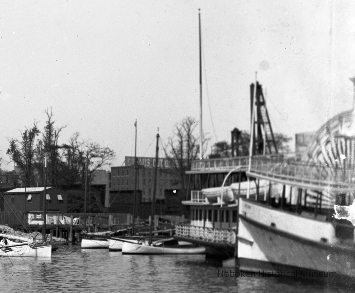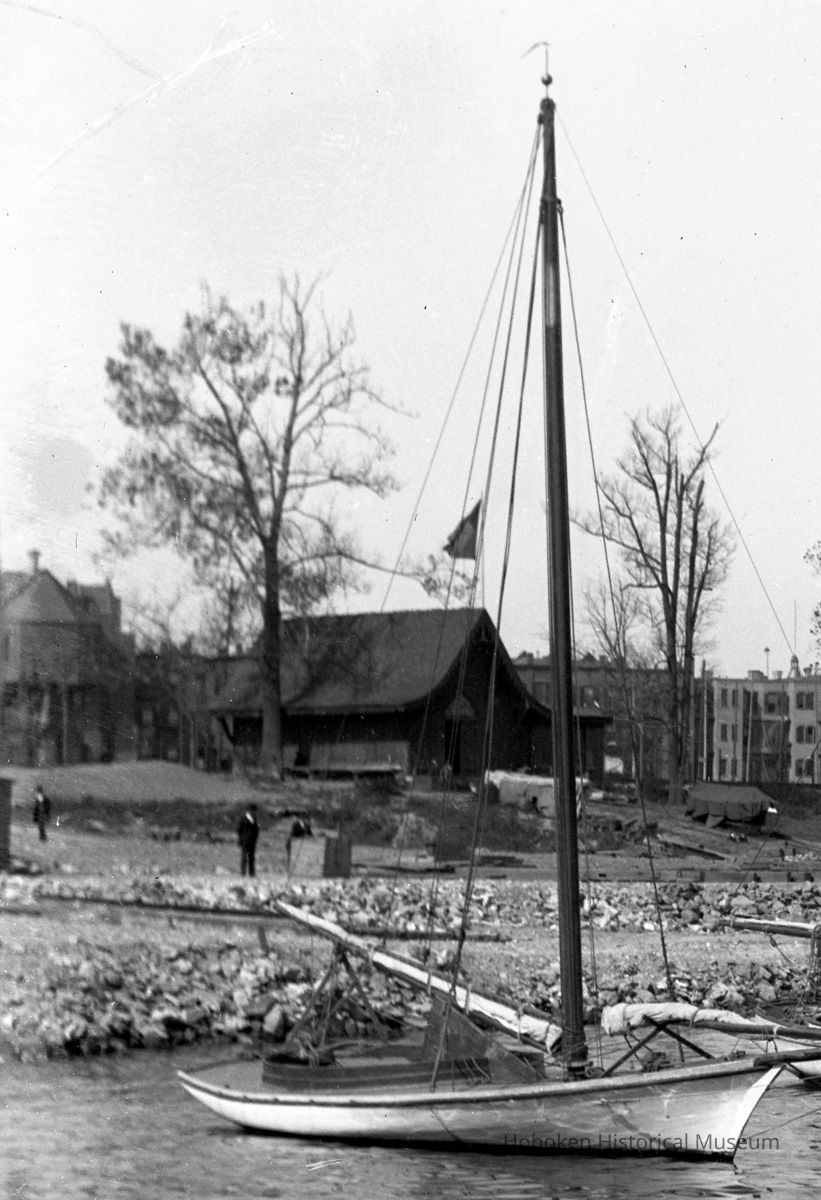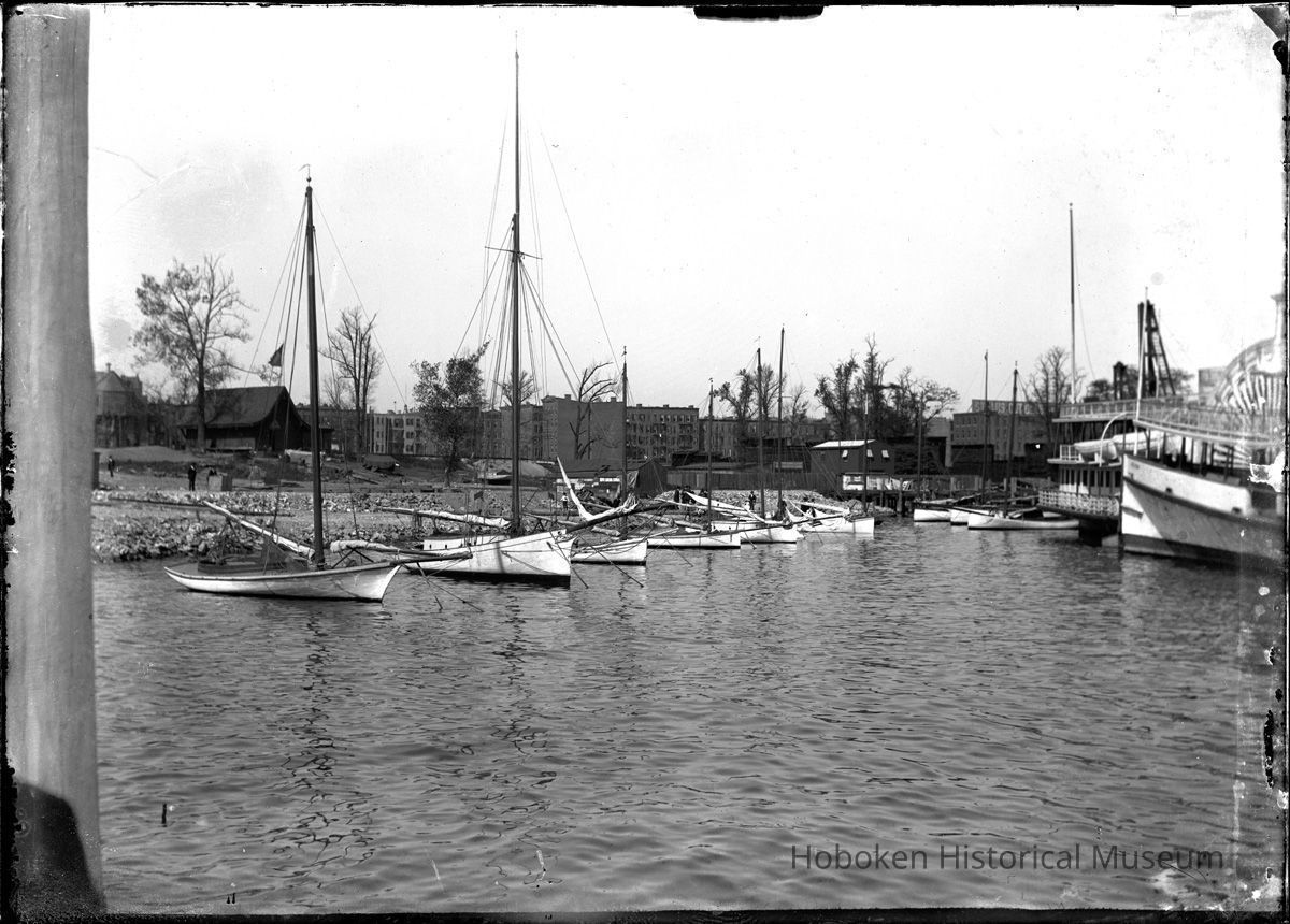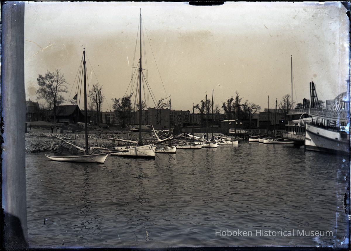 B+W photo negative of riverfront near N.J. Yacht Club (former N.Y. Yacht Club clubhouse), Hoboken, n.d., ca. 1894-1897.