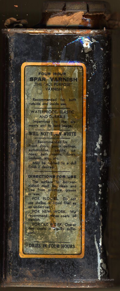Container: Four Hour Spar Varnish, Manufactured by Hotopp Varnish Co., Hoboken, no date, ca. 1900-1920. Printed metal can, one quart, ca. 6" high x x 4" wide x 2-1/2" deep; with cap.
