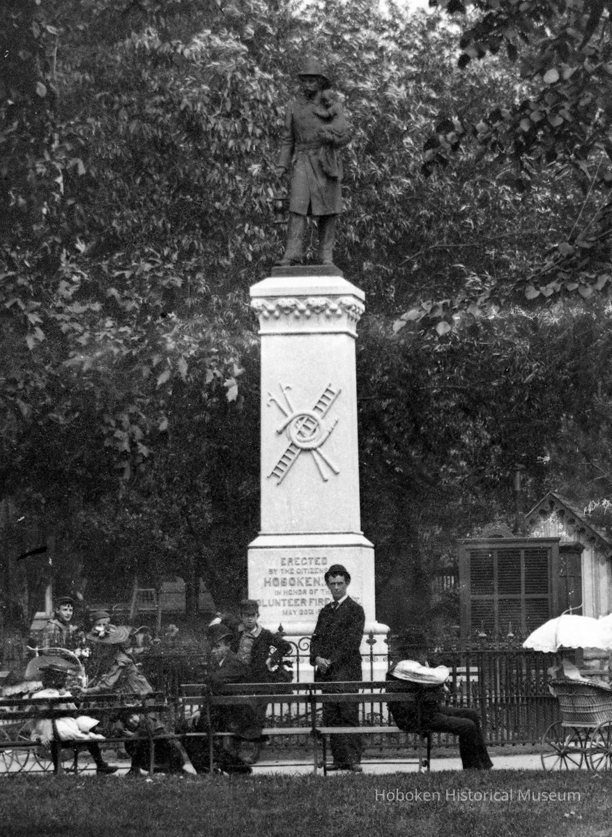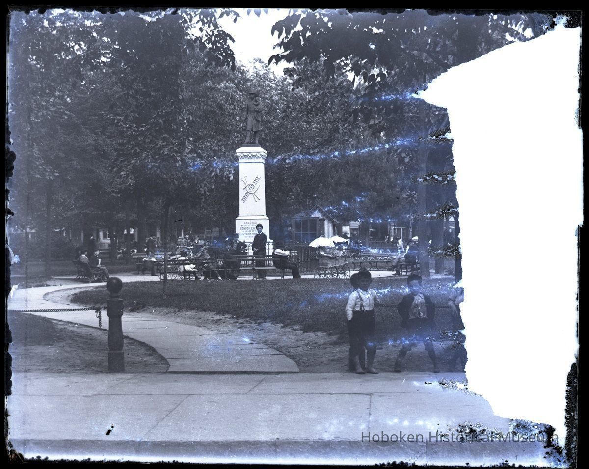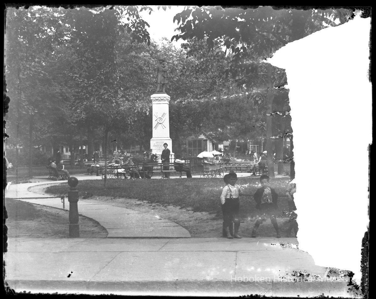 Black-and-white photographic negative of the Volunteer Firemen's Memorial Monument, west side of Church Square Park, Hoboken, no date, circa 1891-1895.