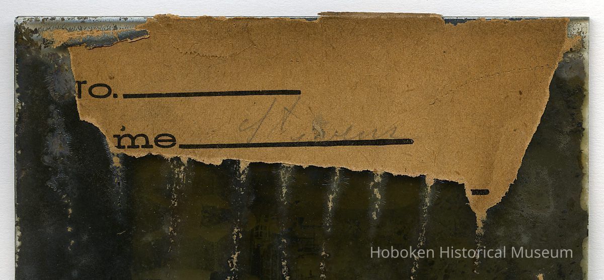 4" x 5" wide glass plate negative (see accession notes). Photographer not indicated. Remains of original paper sleeve adhered to emulsion side.
