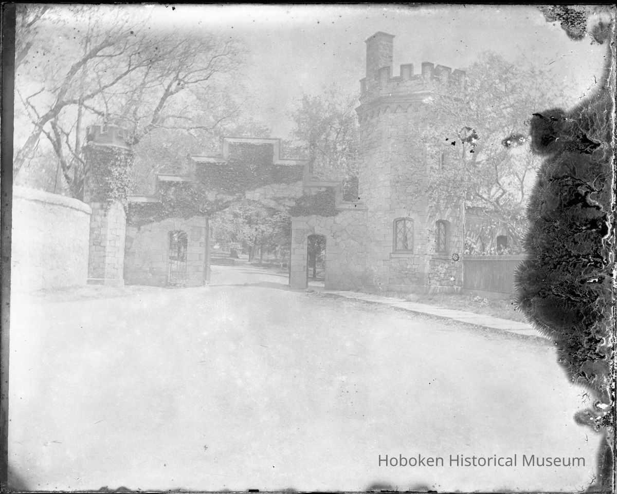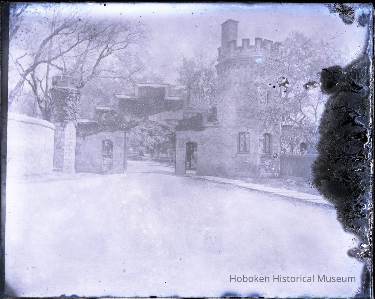 B+W photo negative of Sixth Street Gatehouse to Castle Point (Stevens Institute of Technology), Hoboken, n.d., ca. 1880-1890.