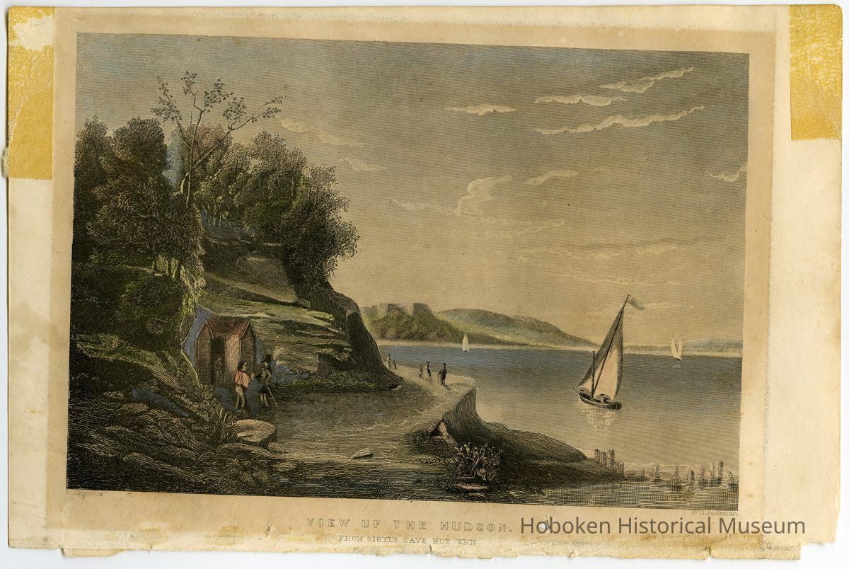 It is an early view of River Walk and Sybil's Cave showing a bucolic Hoboken and a placid Hudson River with three sailboats in view. Visitors are seen at the Cave and in the distance along River Walk heading towards Elysian Fields.
