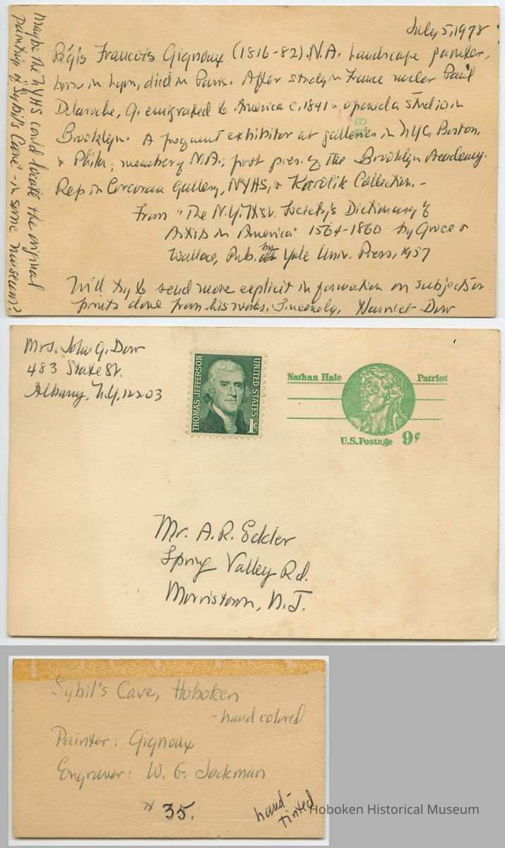 Two documents from donor A. Ross Eckler (author of "History and Legend of Caves" published on pp. 46-49 in The Caves of New Jersey. Richard F.Dalton; Trenton, N.J.: Bureau of Geology & Topography, 1976 - PDF of full work is on file with this record) including a postcard of July 5, 1978 about the work and artist from Harriet Dow (Mrs. John G. Dow) and a sale or auction card with lot number.