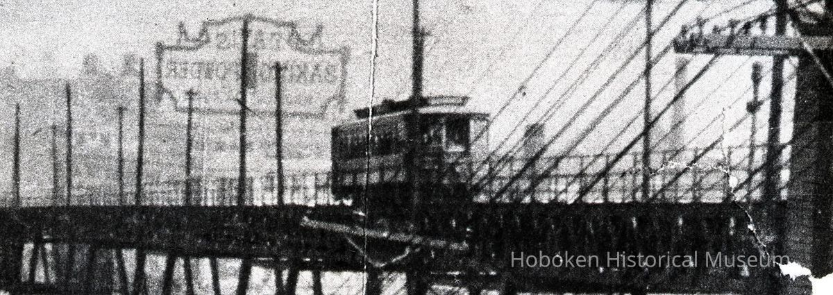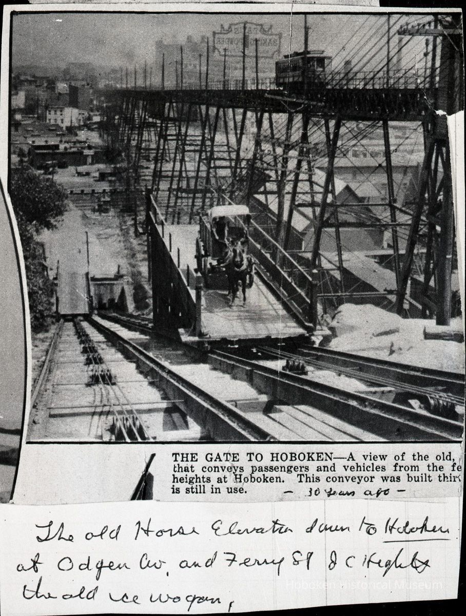 3. newspaper published photo of horse wagon elevator from Jersey City Heights to Ferry Street; elevated streetcar trestle; Davis Baking Powder rooftop sign.