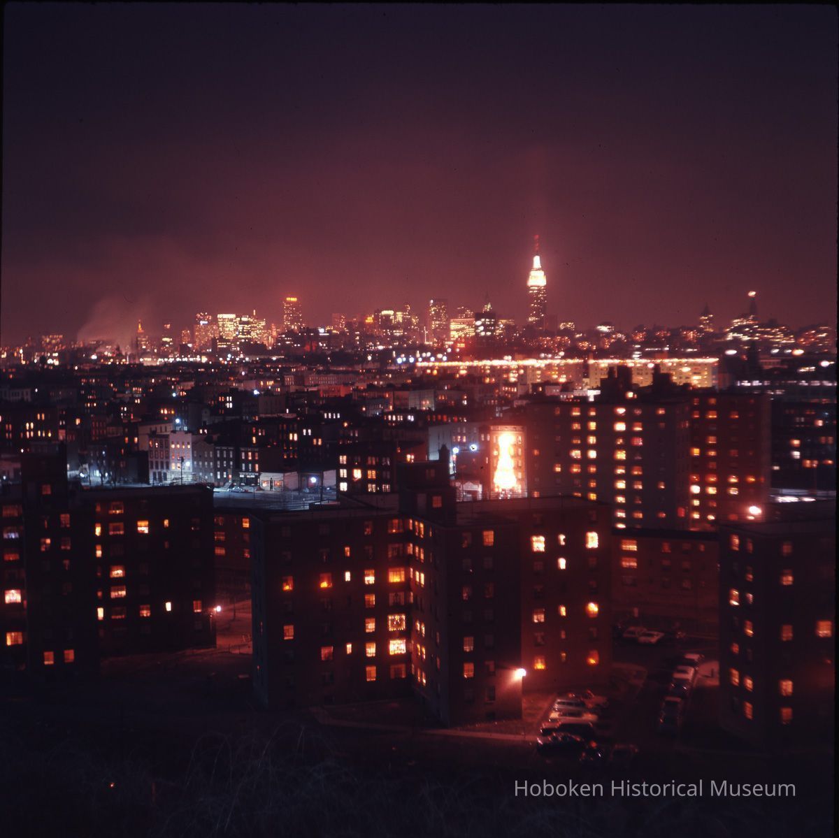 Color photograph of night view to New York from Riverview Park of Hoboken, Jan. 1969.