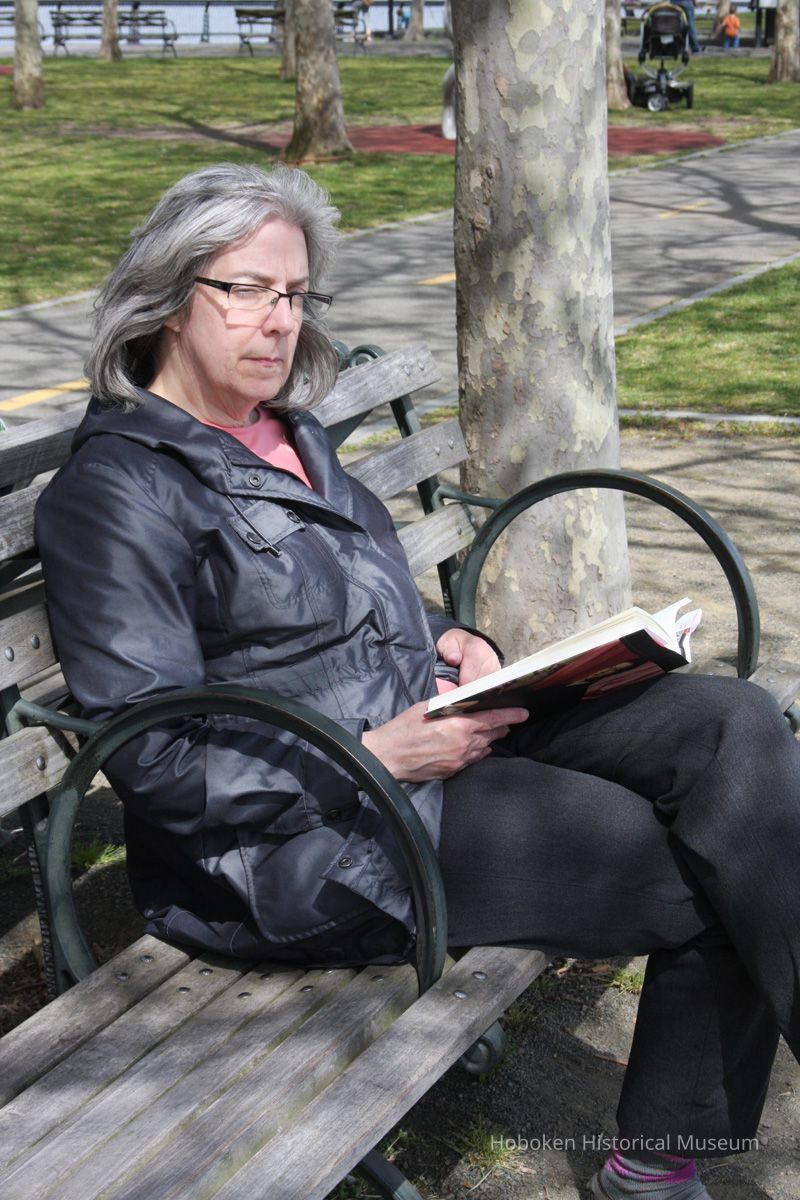 Color photographs, four, of Claire Lukacs of Hoboken reading in Pier A Park, Hoboken, April 4, 2012.