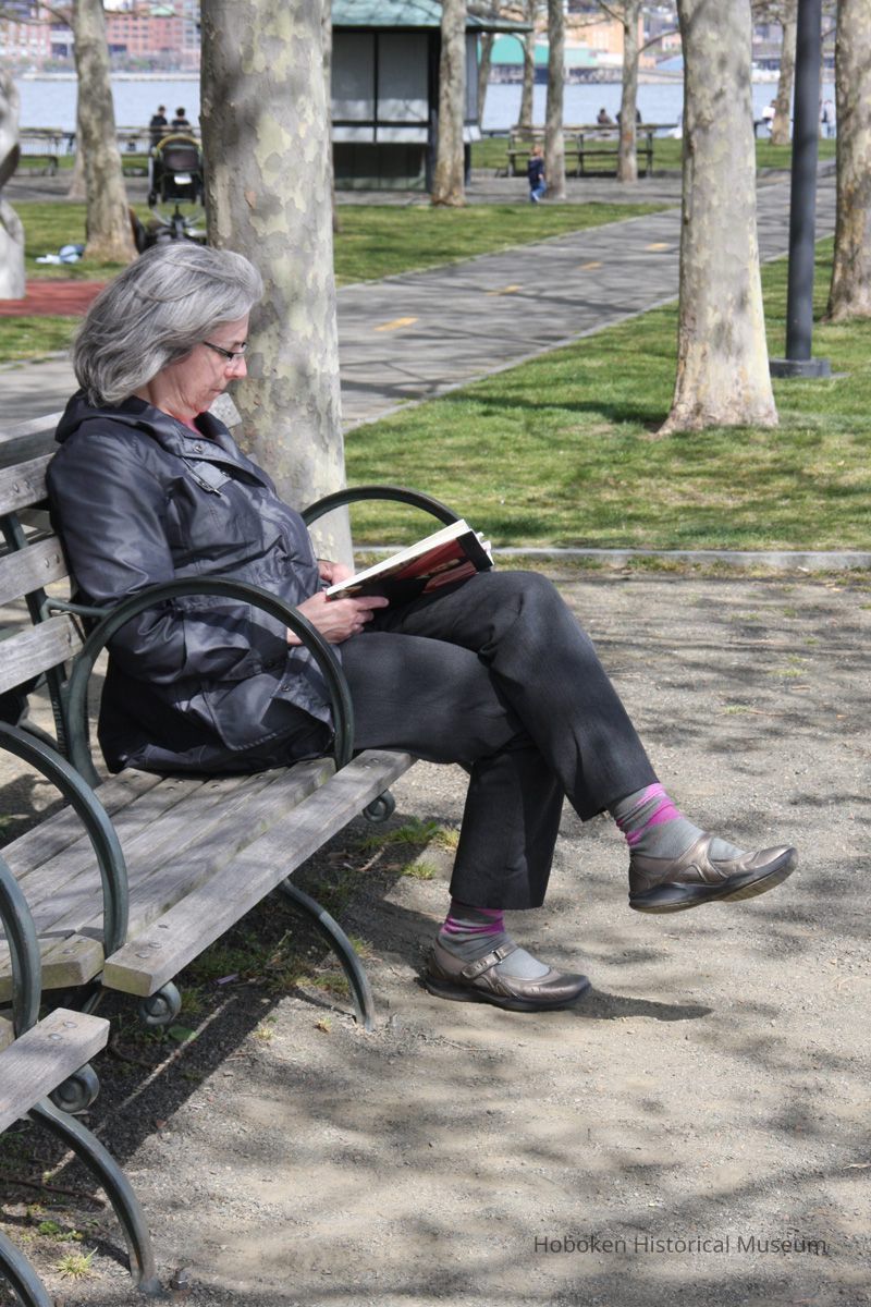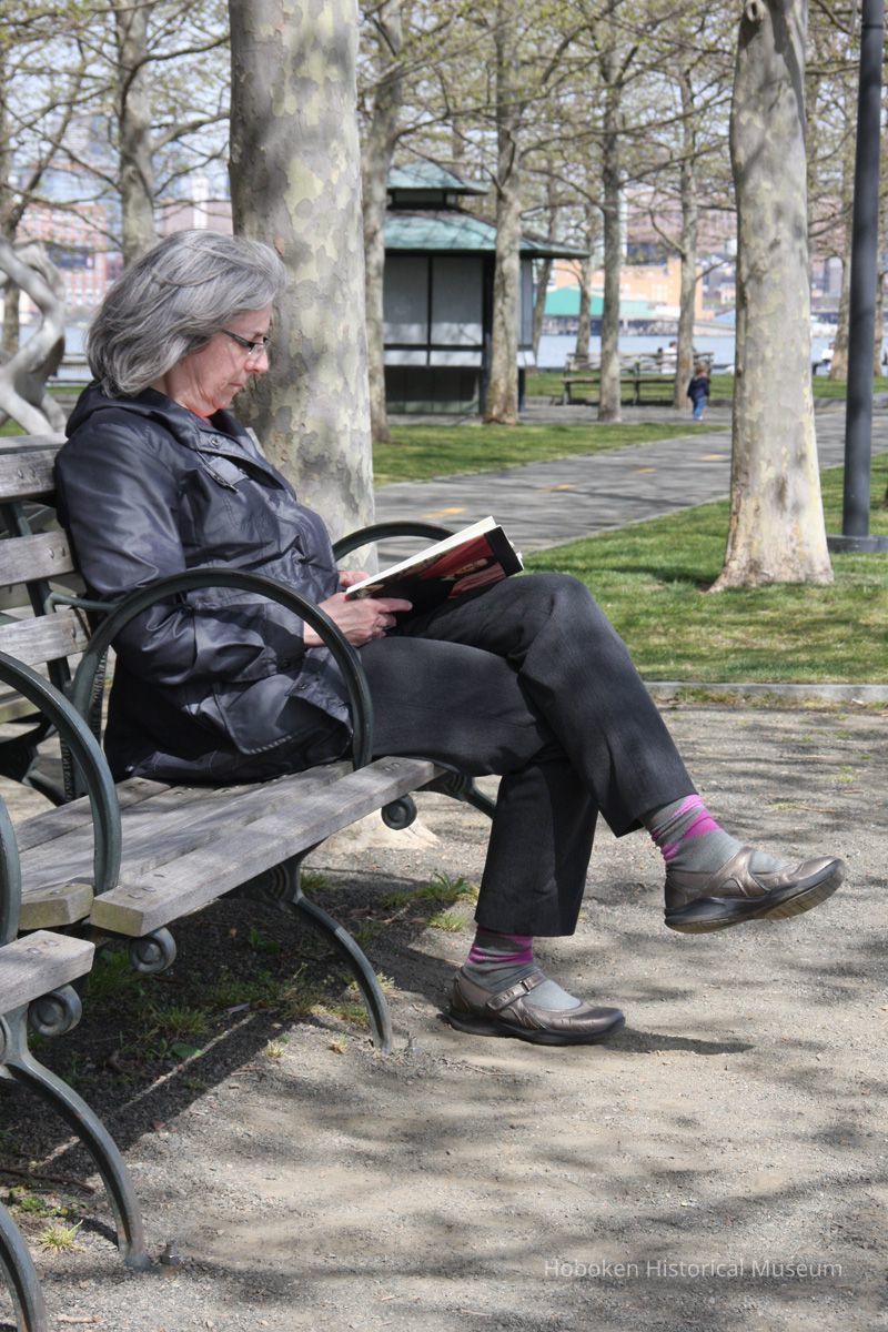 Color photographs, four, of Claire Lukacs of Hoboken reading in Pier A Park, Hoboken, April 4, 2012.