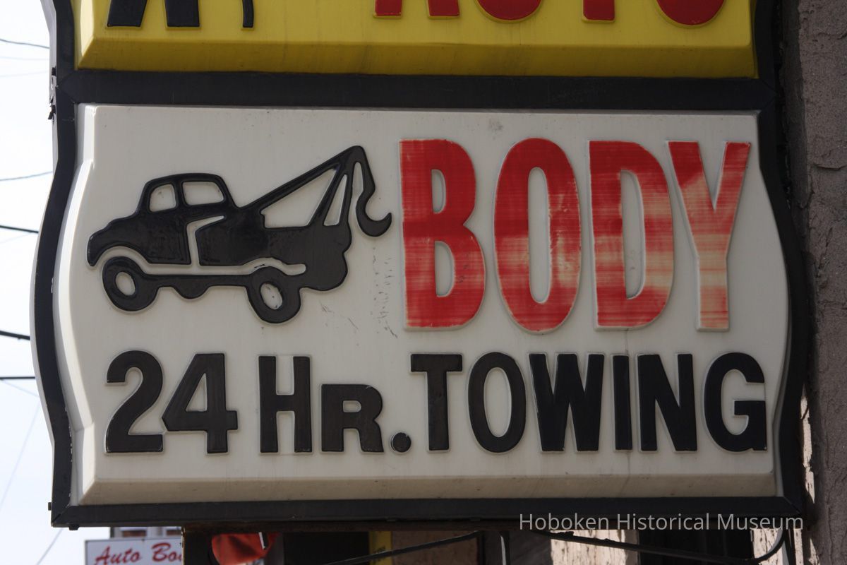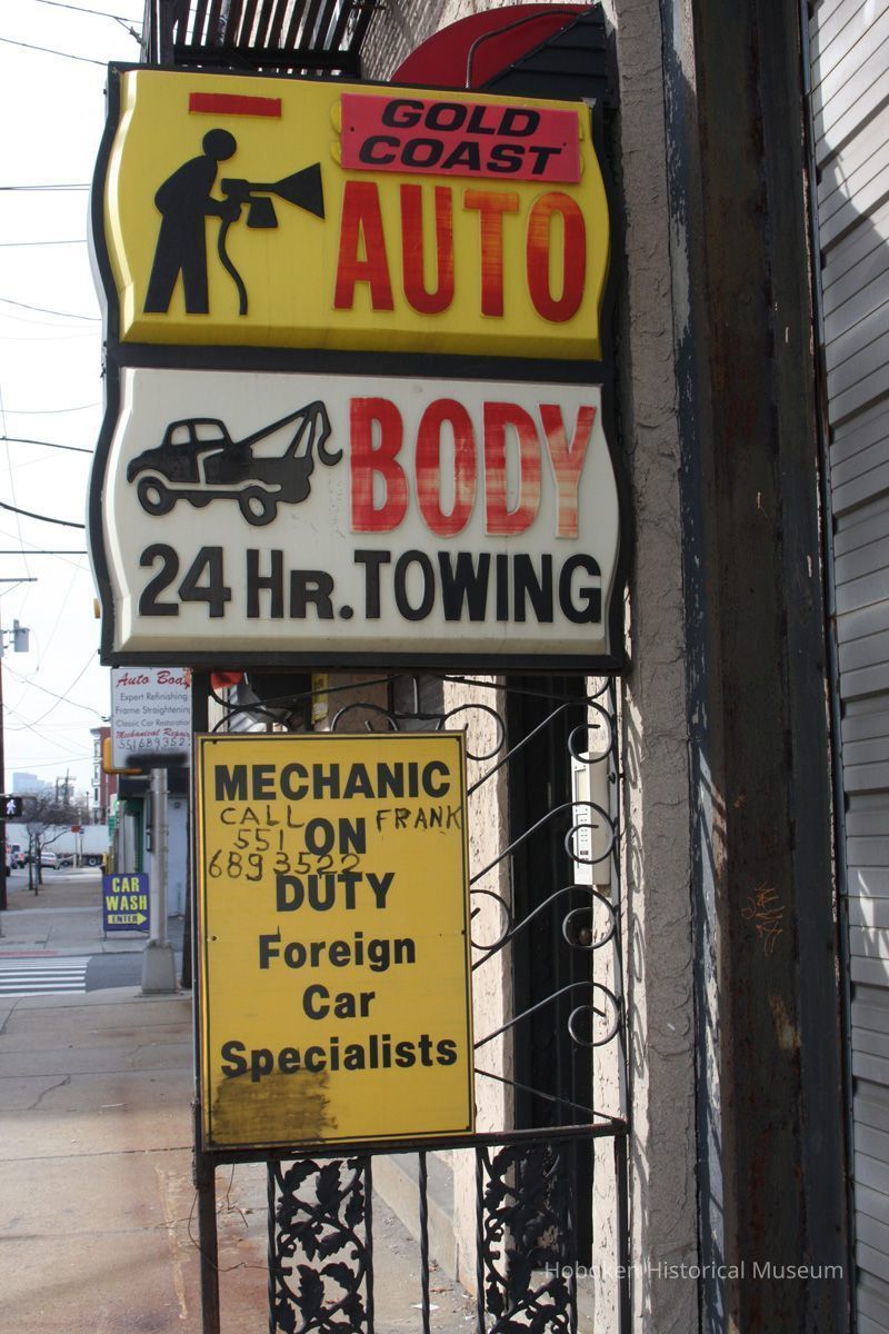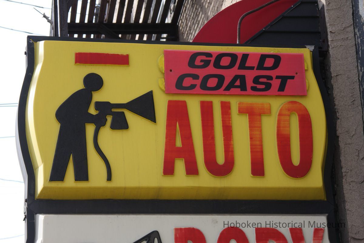 Color photographs, 4, of former Gold Coast Auto Body (previously Spina), Park Ave. signage, Hoboken, Feb. 21, 2012.
