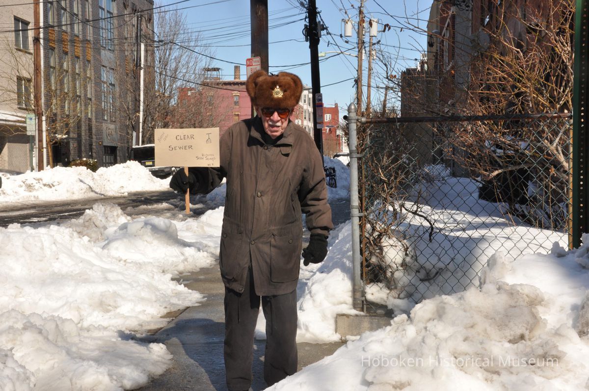 Color photos, 2, Jack O'Brien protesting uncleared snow, Willow Ave. near 6th St., Hoboken, Feb. 2014.