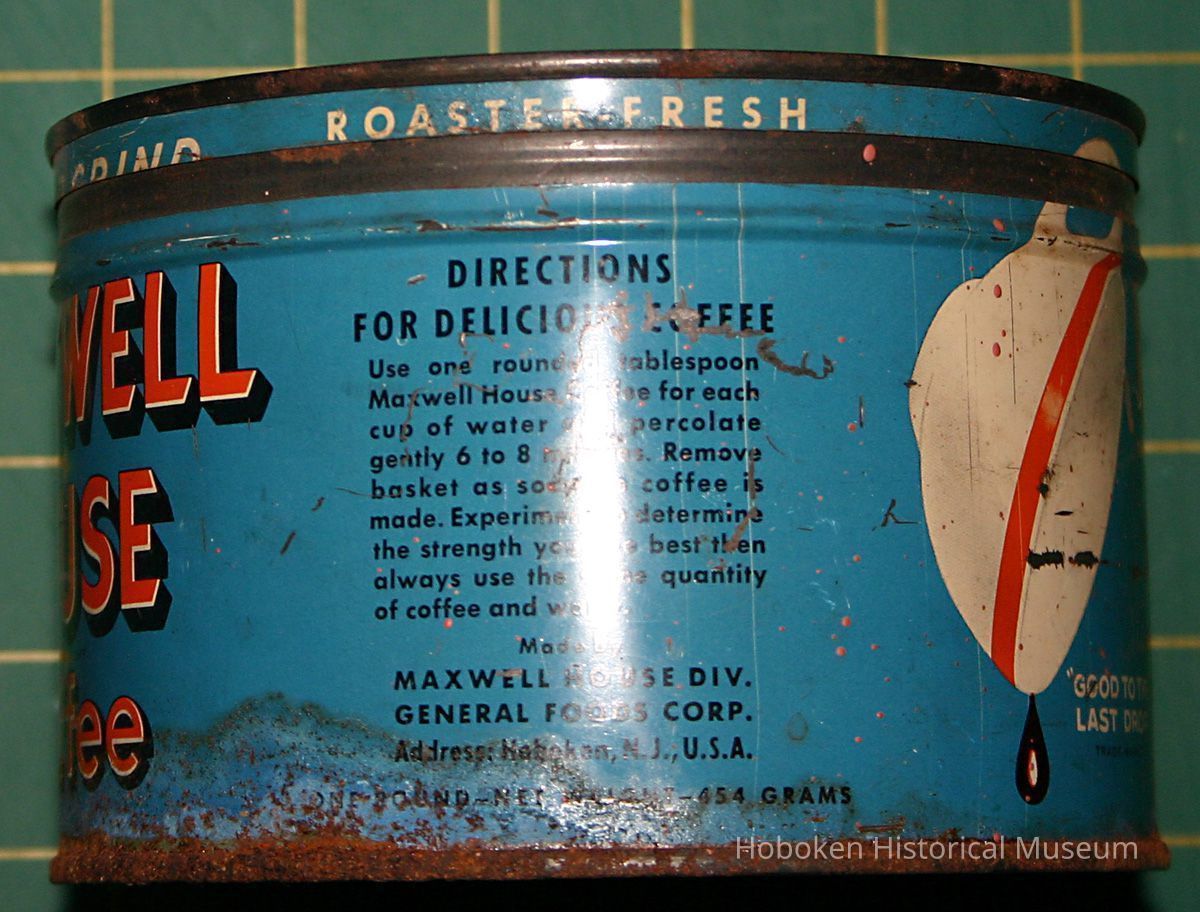 Maxwell House Coffee, 1 pound can, regular grind, Hoboken,no date, ca. 1950's. Printed metal with lid; can opened and orginal contents not present; key not present at bottom. Fair to poor condition.