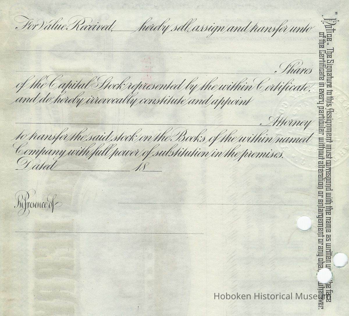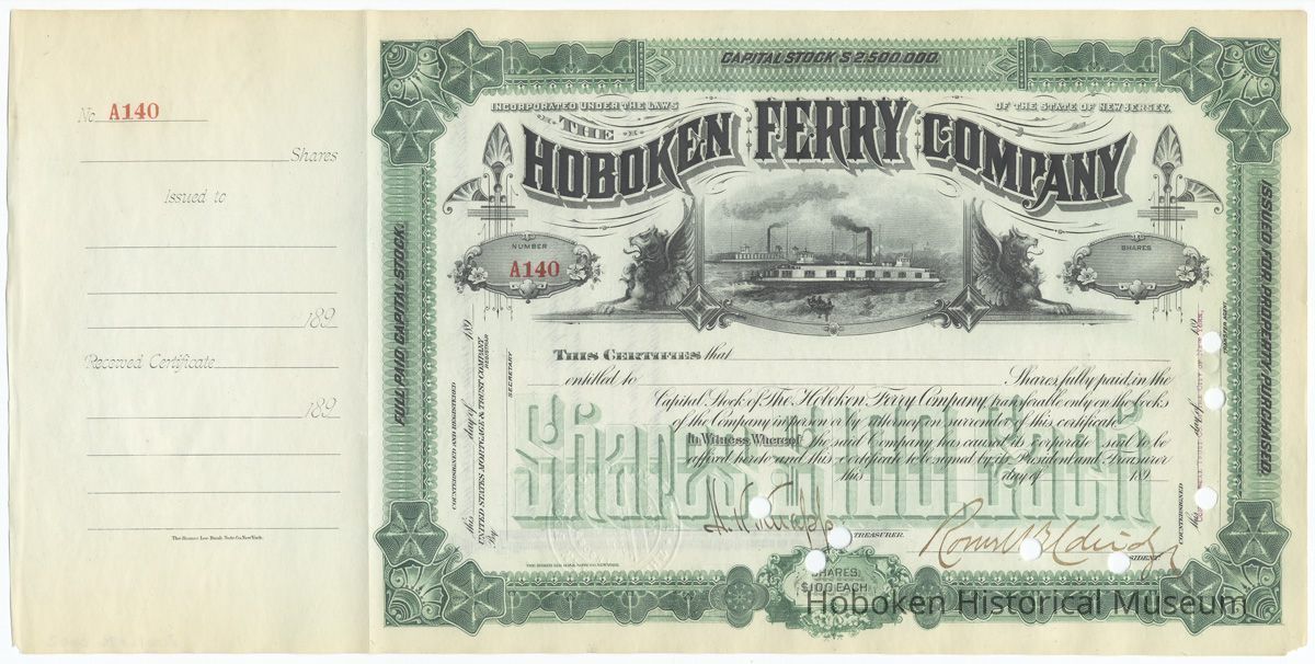 Stock certificate: Hoboken Ferry Company, No. A140, unregistered, canceled, from the 1890's.