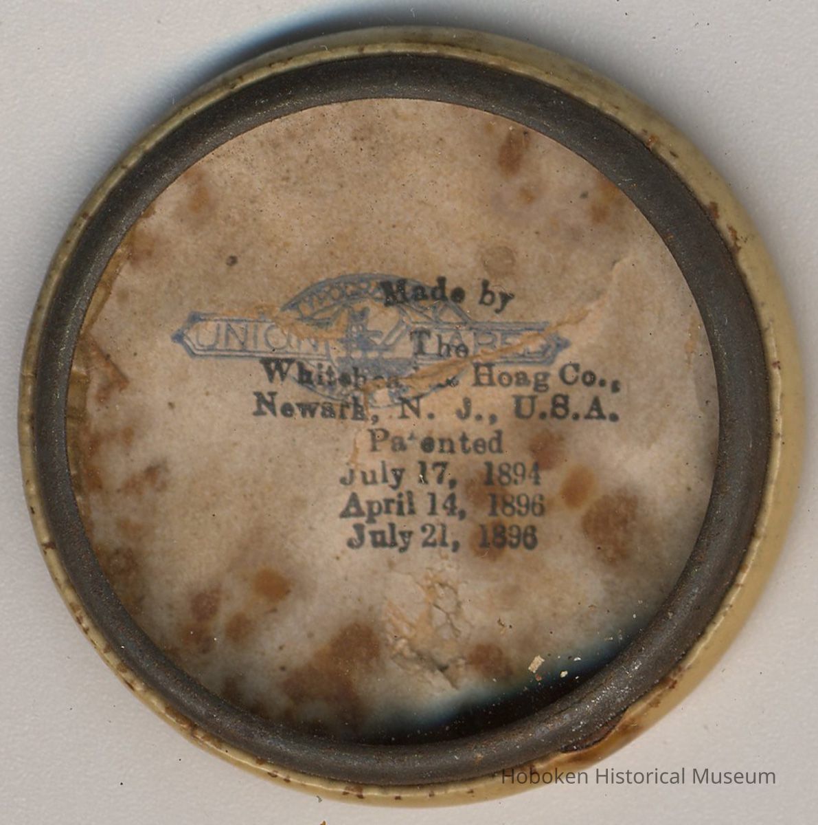 Button: Hoboken Walking Club. First Walk, Coyettsville to Nyack, Twenty Miles. [Hoboken], no date, circa 1896-1905. 1-1/4" diameter plus pin. Manufacturer's label inserted in back with latest patent date of July 21, 1896.