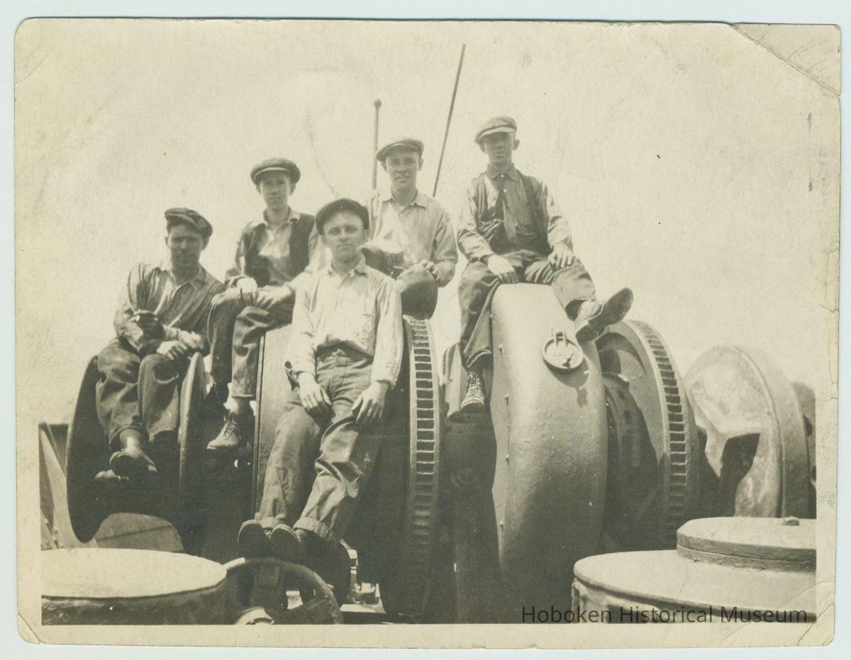 B+W photo of 5 workers at Tietjen & Lang Dry Dock Co., Hoboken, ca. 1916-1918.