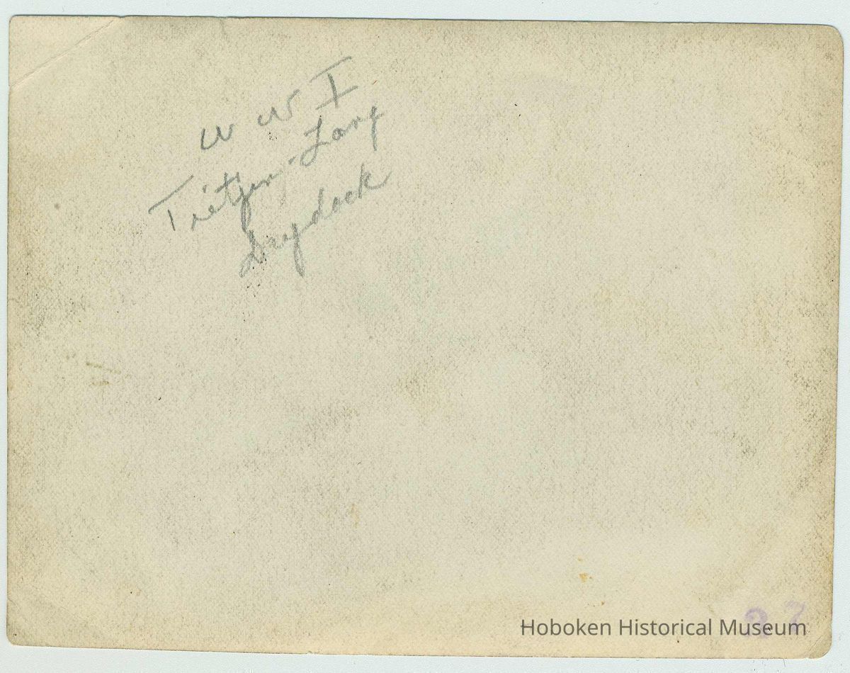 Black-and-white photo of 5 workers at Tietjen & Lang Dry Dock Co., Hoboken, ca. 1916-1918. 3-1/4" high x 4-1/4" wide. Reverse has holographic pencil notes and an ink stamped number.