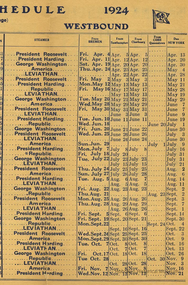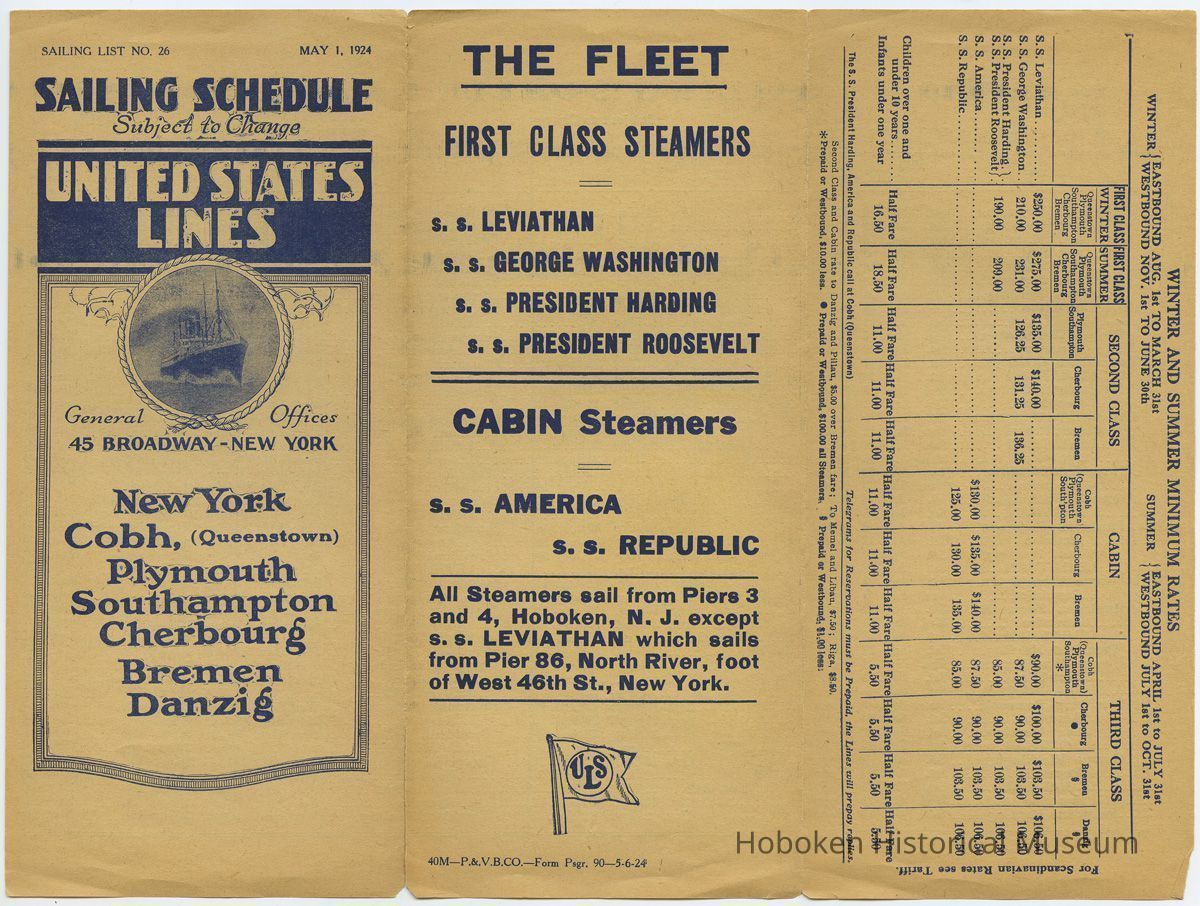 Brochure: United States Lines. Sailing Schedule. Sailing List No. 26. May 1, 1924.