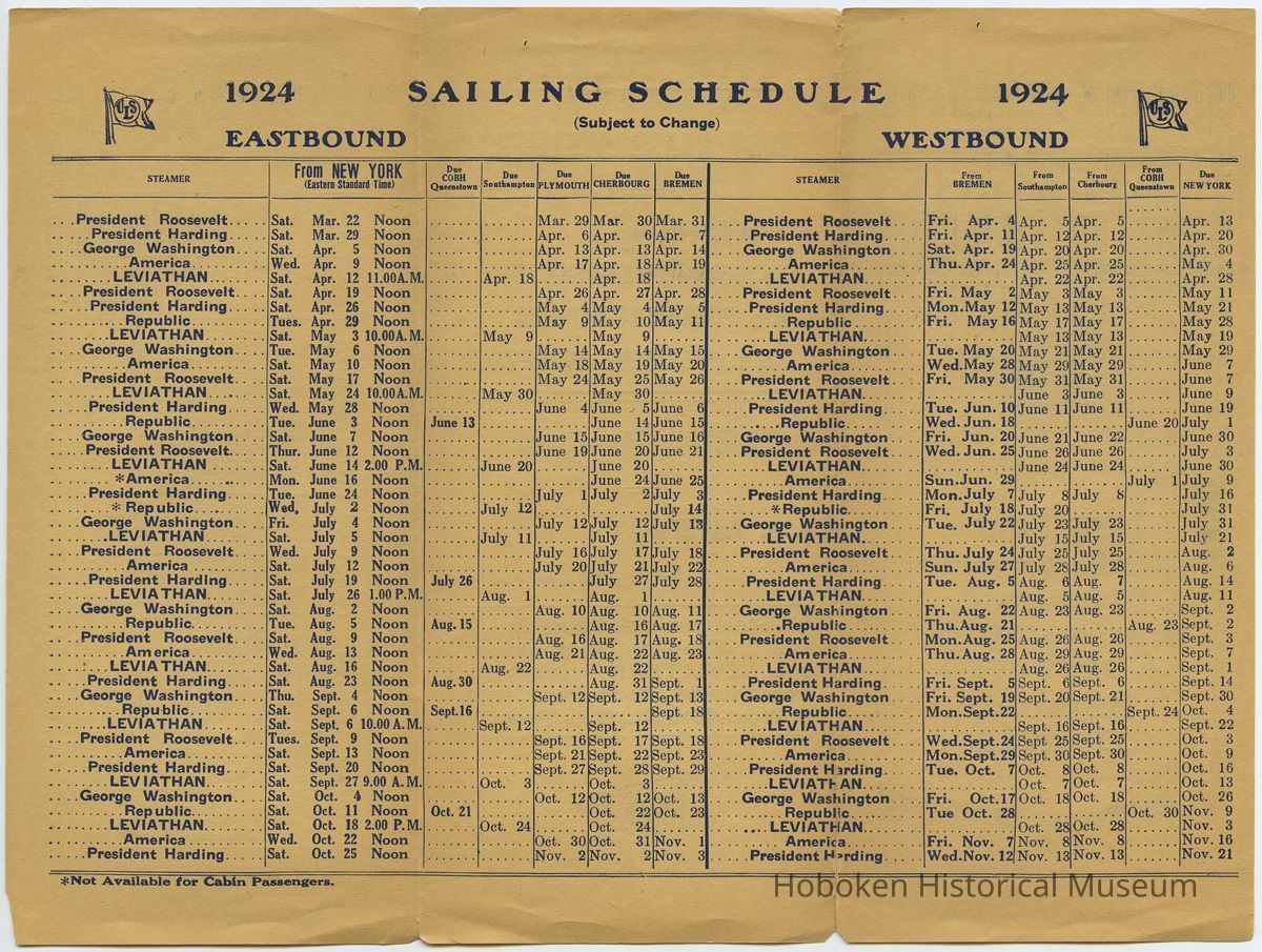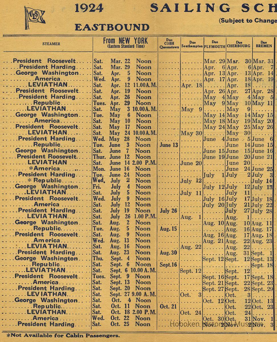 A timetable or schedule for this line whose fleet was former ocean liners that had been troopships for the U.S. Army Transport Service in World War I. Most of them served that duty in Hoboken when it was the Port of Embarkation and, later, Debarkation. Many retained the same wartime name or reverted to their original designation after being converted back to civilian use. They were under the control of the United States Shipping Board.