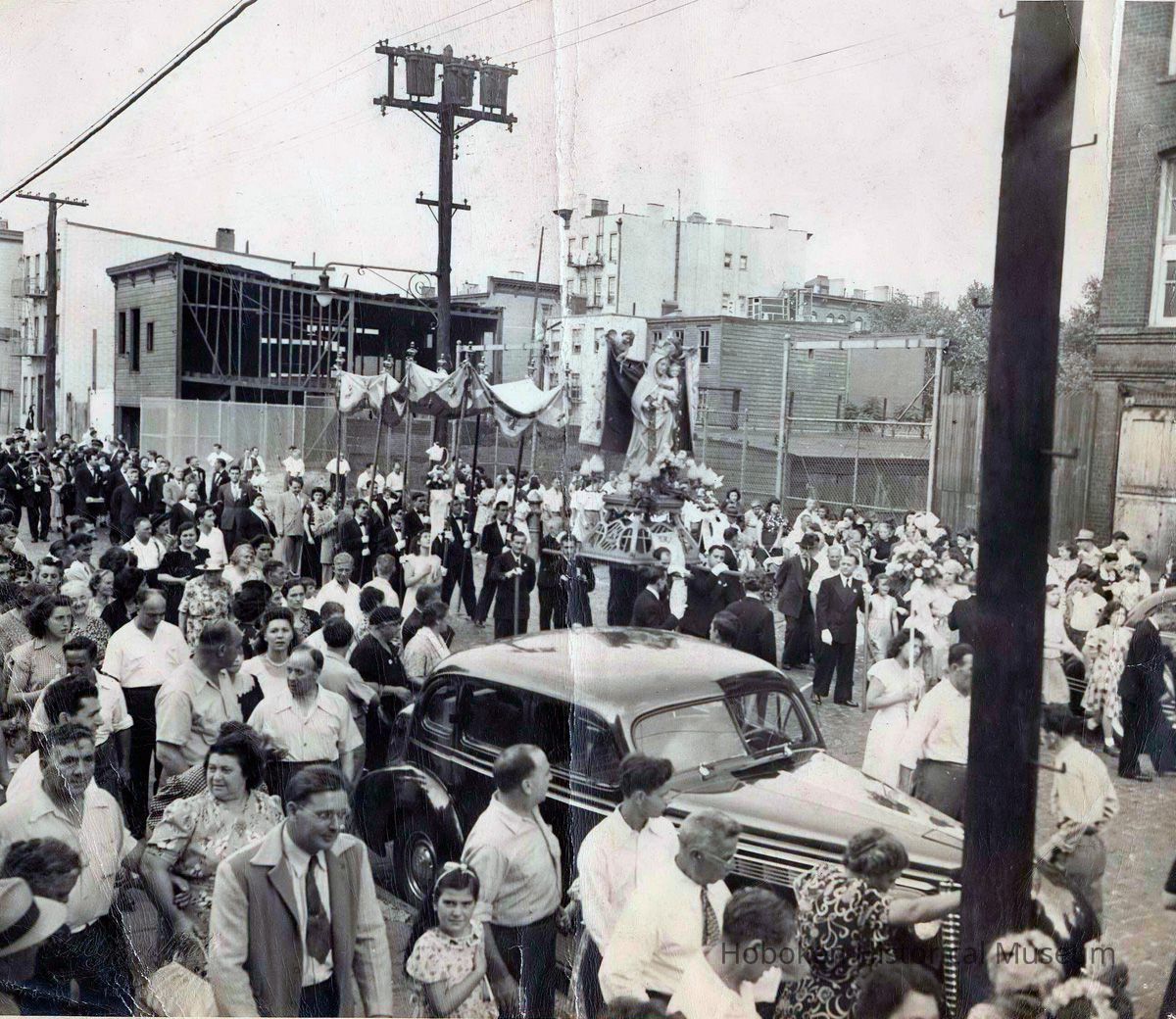 Black-and-white photo of the procession with the Madonna for St. Ann's Feast, St. Ann's Church, Hoboken, no date. ca. 1940. The exact street location is not known.