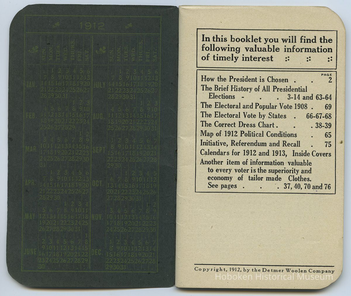 Book, memo: Brief Political History 1789-1912. Issued by Cohen Brothers, Expert Tailors, 105 Washington St., Hoboken, N.J., 1912.