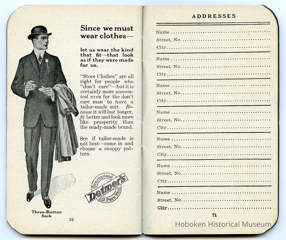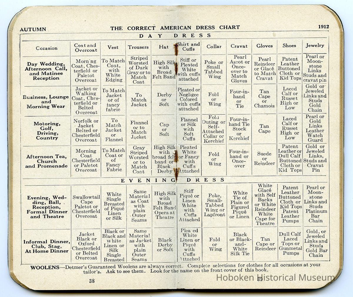 A promotional advertising gift for clients or customers. Published for the Detmer Woolen Company (copyright 1912) for which there are four full-page illustrated ads for their men's clothing, Detmer's Guaranteed All Pure Wool. Pages 38-39 has a chart: The Correct American Dress Chart, Autumn 1912. Company logo and promotional text also on back cover.