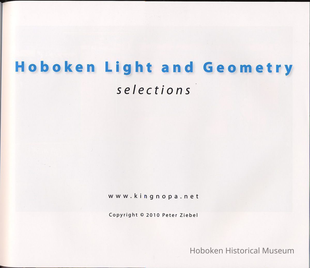 Hoboken Light and Geometry: selections by Peter Ziebel. www.kingnopa.net. Copyright 2010 by Peter Ziebel. (Hoboken: privately printed, 2010.) [blurb.com]. Oblong 8vo hardcover (8-1/4" x 10" wide); printed paper over boards. pp. [ii], 78.