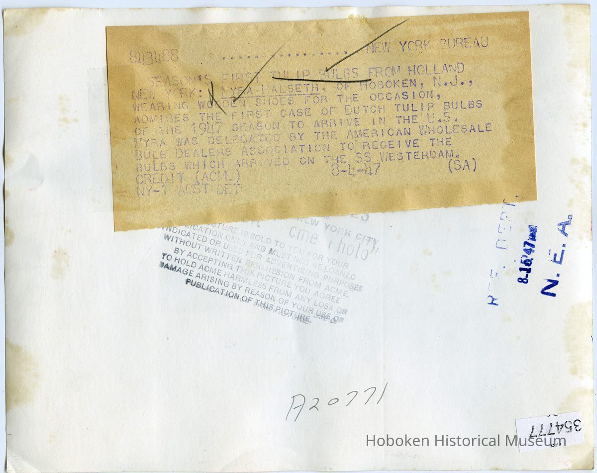 B+W photo of Myra Halseth of Hoboken posed with 1st tulip bulbs arriving from Holland on S.S. Westerdam, Hoboken, Aug. 4, 1947.