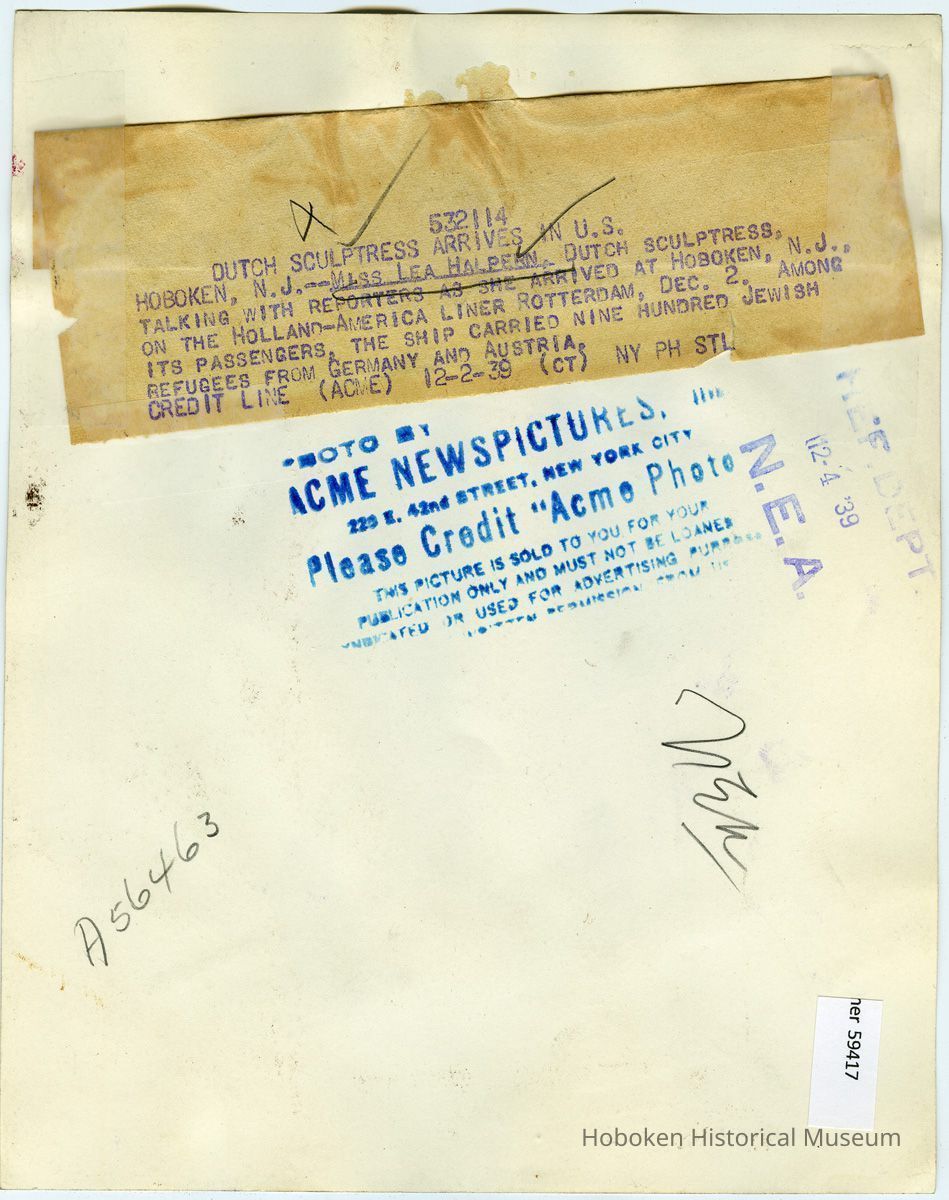 B+W photo of of Dutch sculptor Lea Halpern arriving in Hoboken on S.S. Rotterdam of Holland America line, Dec. 2, 1939.