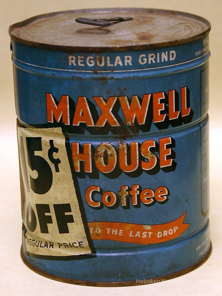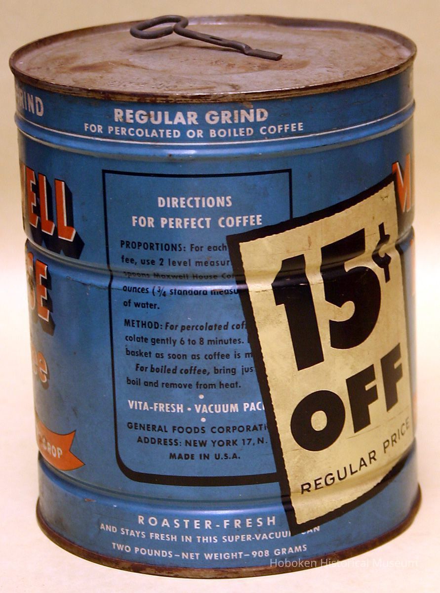 Unopened: orginal contents in can. Dented, scratched, rusted. The date of this can is tentative; note that it is labeled and has directions on can for percolated coffee and boiled coffee. Although the company name is listed as General Foods Corporation, this can was probably produced at the Maxwell House Coffee Division in Hoboken.