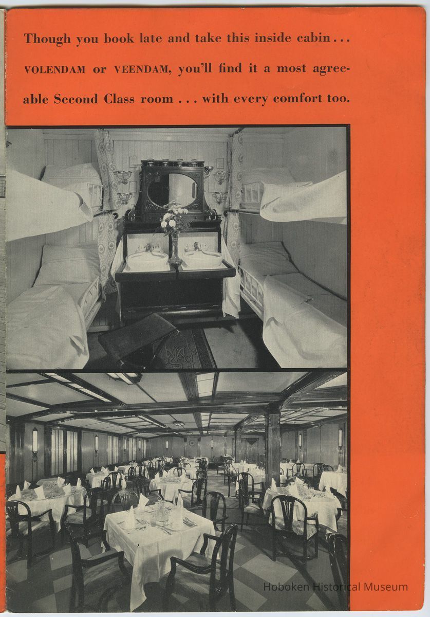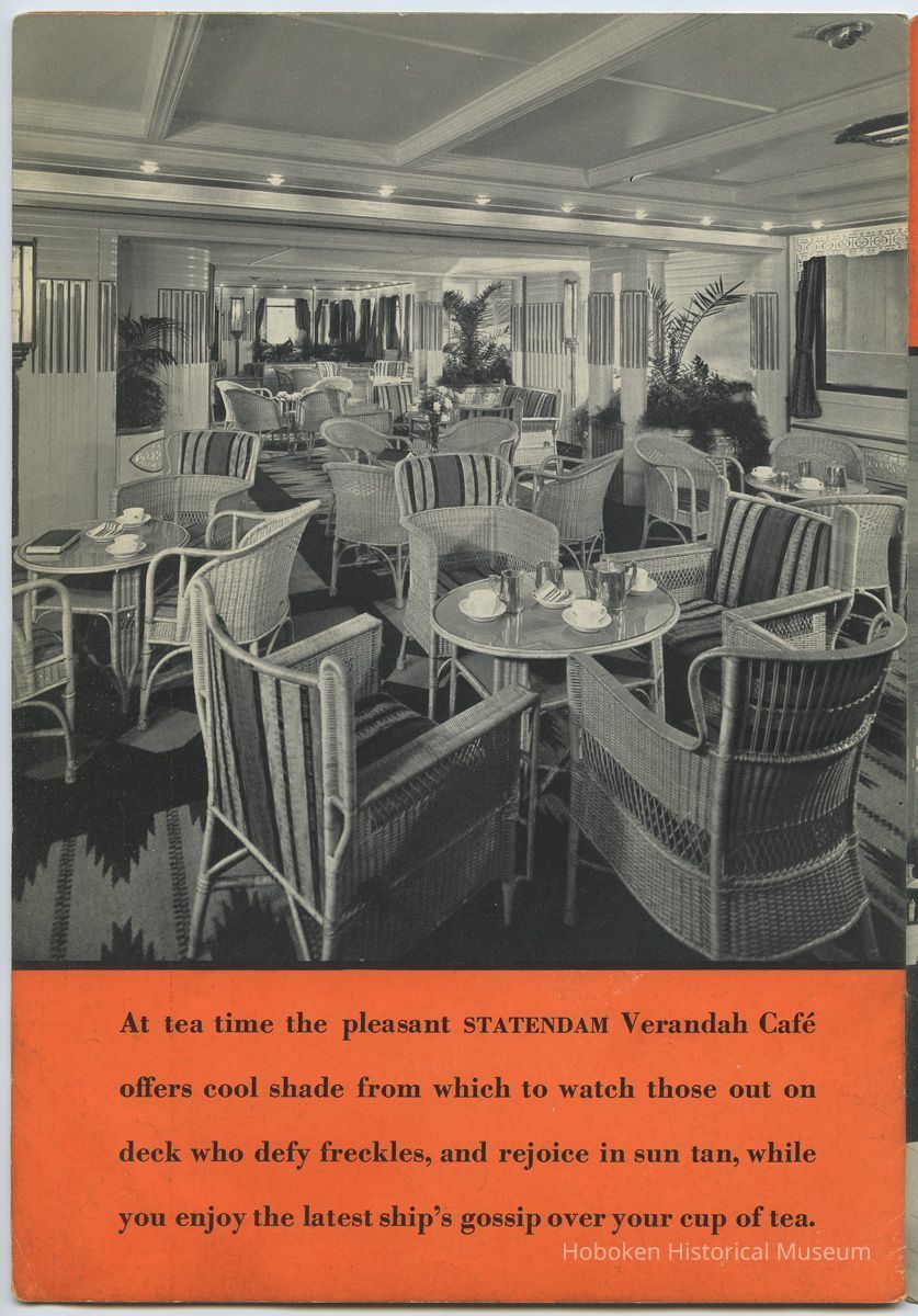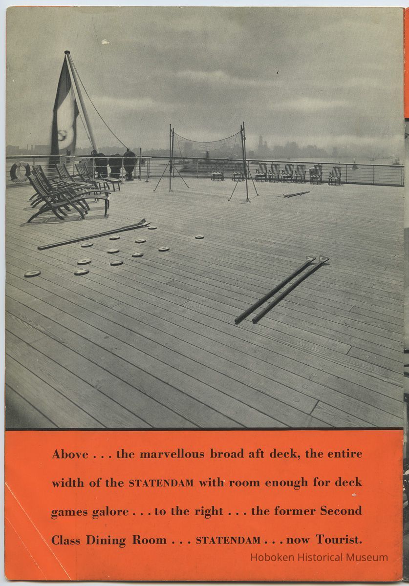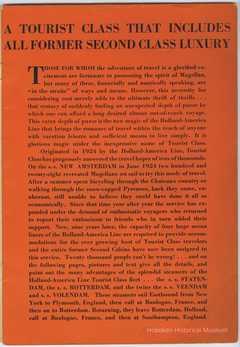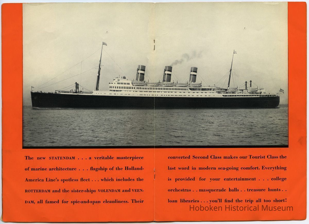Promoting the ocean liner S.S. Statendam as well as Tourist Class which replaced Second Class on its passenger ships. Most views are of the Statendam with two from the Rotterdam and two from the Volendam or Veendam.