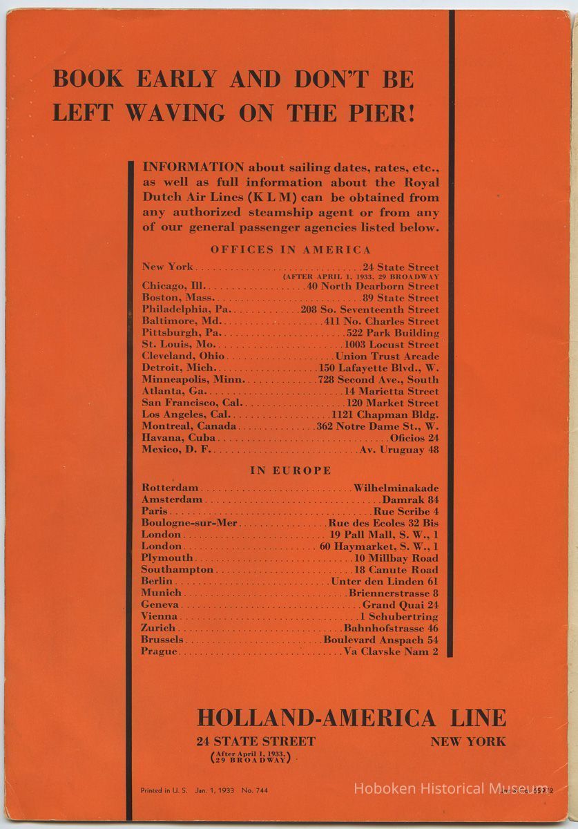 Dated on page [16] which also notes that the New York office of the company, 24 State St., would be at 29 Broadway after April 1, 1933. Note that its name, Holland America, is hypenated in this publication.