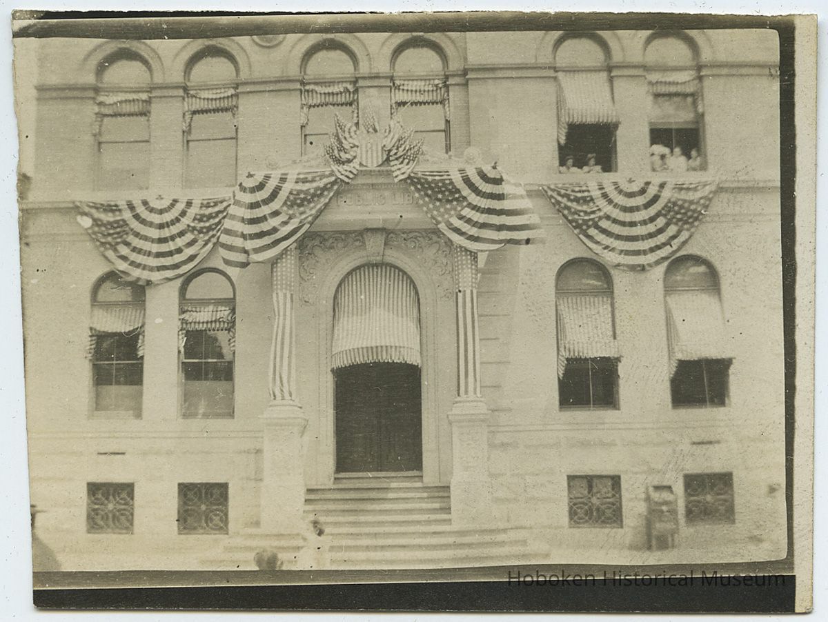 B+W photo of Free Public Library, lower facade 5th St. side, with bunting, Hoboken, n.d., circa 1912-1920.