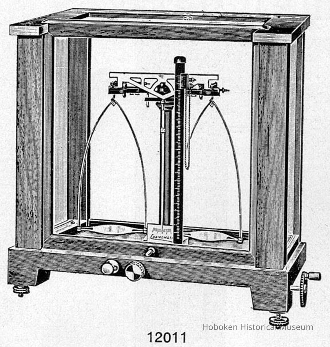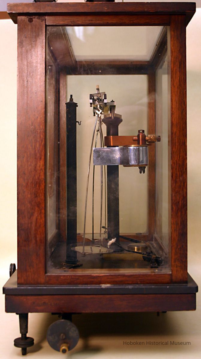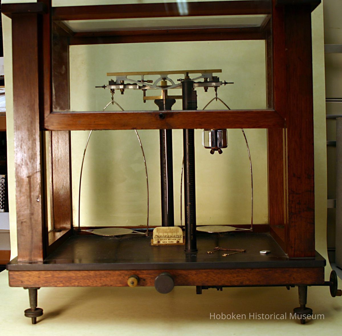 Christian Becker Chainomatic analytical balance from science classroom of Stevens - Hoboken Academy, Hoboken, in use circa 1935-1975. Mahogany wood case, clear and black glass plus various metal pieces; enclosed are two small brass gram chains. Overall dimensions, closed: 17-1/2" high x 18" wide x 10" deep. Date of manufacture and model / serial number not indicated; probably made 1930-1935.