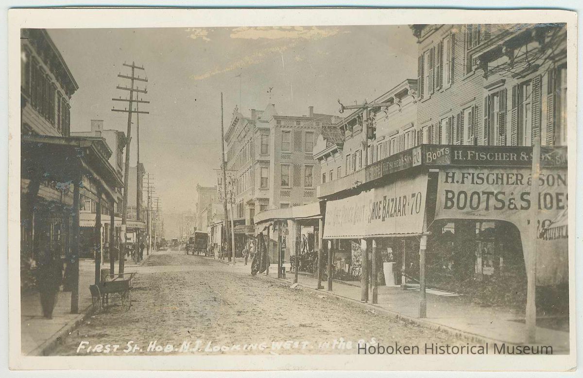 Sepia-tone photo (postcard?) of First St., Hoboken, looking west in the 1880's, Hoboken, ca. 1880-89. 3-7/16" high x 5-7/16" wide mounted on cardboard. Reverse is blank. Caption is in image. Note the signage at the right for a German merchant, H. Fischer & Son.