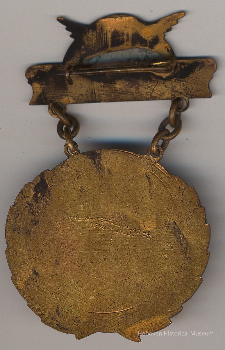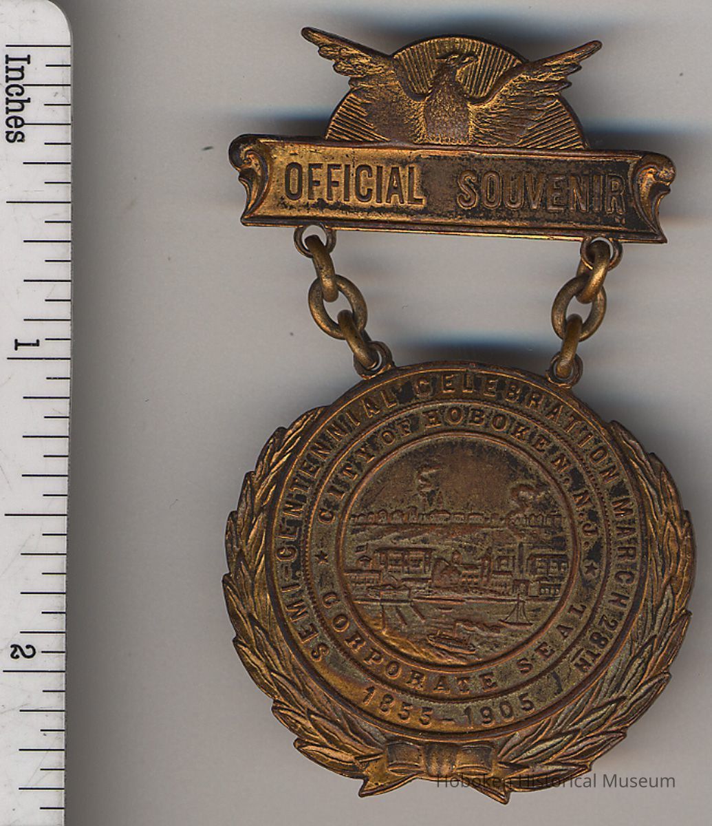 Commemorative medal: Official Souvenir. Semi-Centennial Celebration, March 28th [1905]. 1855-1905. City of Hoboken, N.J. Corporate Seal. Two-piece molded metal with brass gold finish (tarnished), overall 2-1/2" high x 1-1/2" wide. Top piece pin clasp bar with eagle and lettered "Official Souvenir." Lower piece connected to top with two chains, 3 links each, has the other text surrounding the Corporate Seal. Outer portion is a laurel wreath decoration.